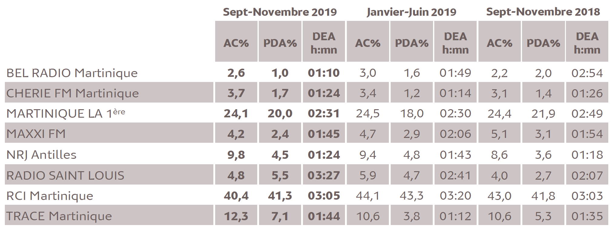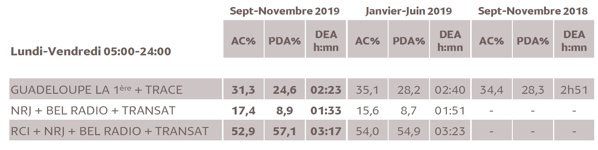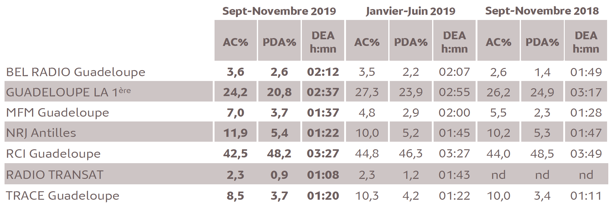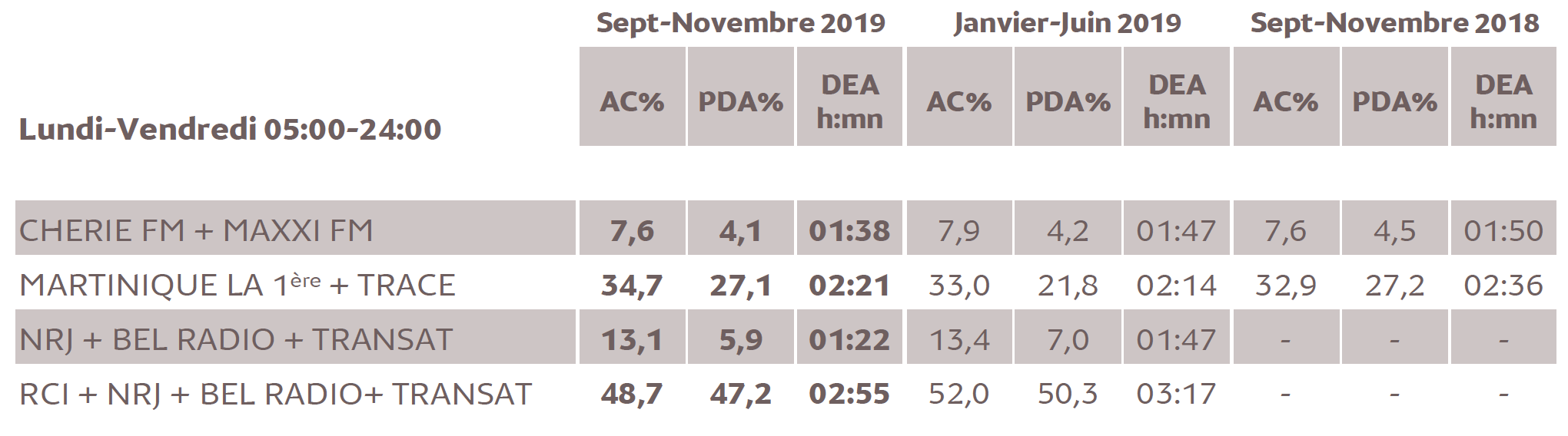 En Guadeloupe, 1% d’audience cumulée en 2019 représente 3 310 personnes âgées de 13 ans et plus. En Martinique, 1% d’audience cumulée en 2019 représente 3 203 personnes âgées de 13 ans et plus. Grand gagnant de cette vague, le Groupe RCI : en Guadeloupe RCI Guadeloupe enregistre une audience cumulée de 42.5% pour 48.2% de PDA et en Martinique, RCI Martinique totalise une audience cumulée de 40.4% pour 41.3% de PDA.