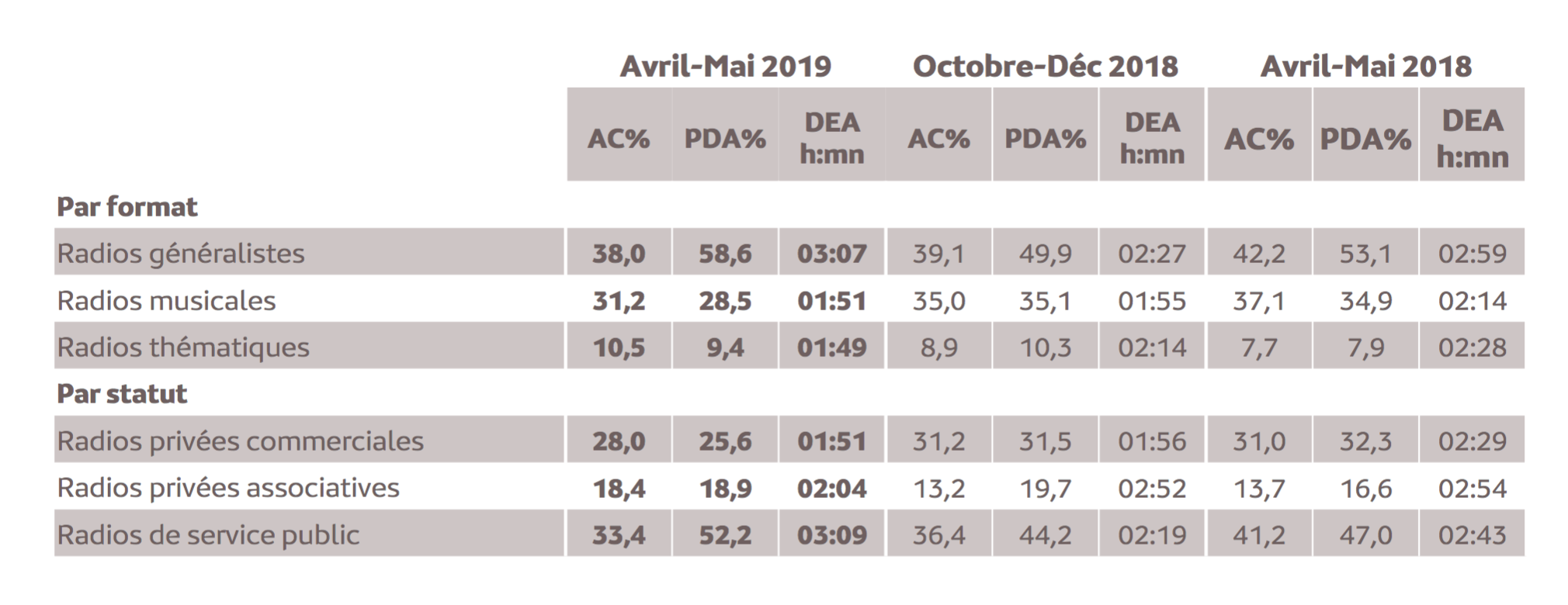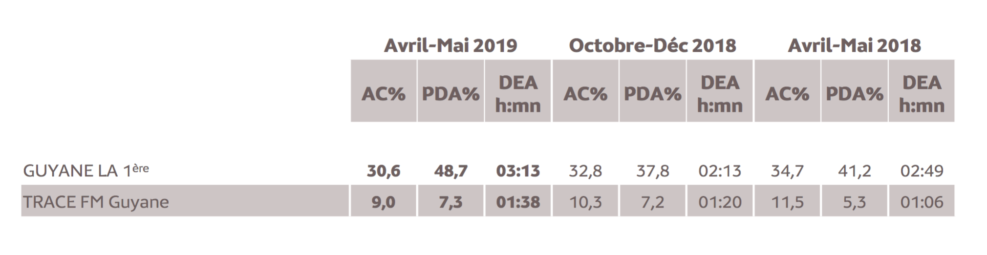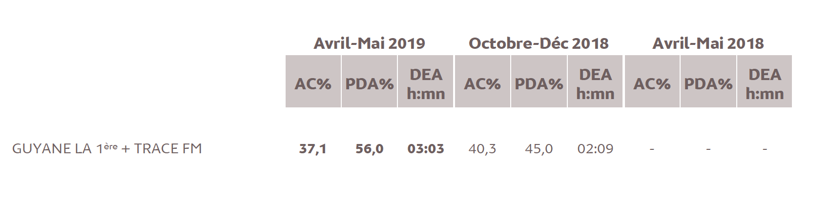 L’étude Métridom avril-mai 2019 sur la télévision et la radio en Guyane a été réalisée du 1er avril au 12 mai 2019 auprès d’un échantillon de 655 personnes représentatives de la population âgée de 13 ans et plus, interrogées en français ou en créole par interviews téléphoniques assistées par ordinateur. 35% de ces interviews ont été réalisées sur téléphone mobile. L'audience cumulée est répartie entre les Généralistes (38.0%), les Musicales (31.2%) et les Thématiques (10.5%). Deux stations apparaissent dans cette nouvelle étude Métridom : Guyane la 1ère (30.6% en AC et 48.7% de PDA) ainsi que Trace FM Guyane (9.0% en AC et 7.3% en PDA). Elles signent respectivement une DEA de 03h13 et de 01h38).