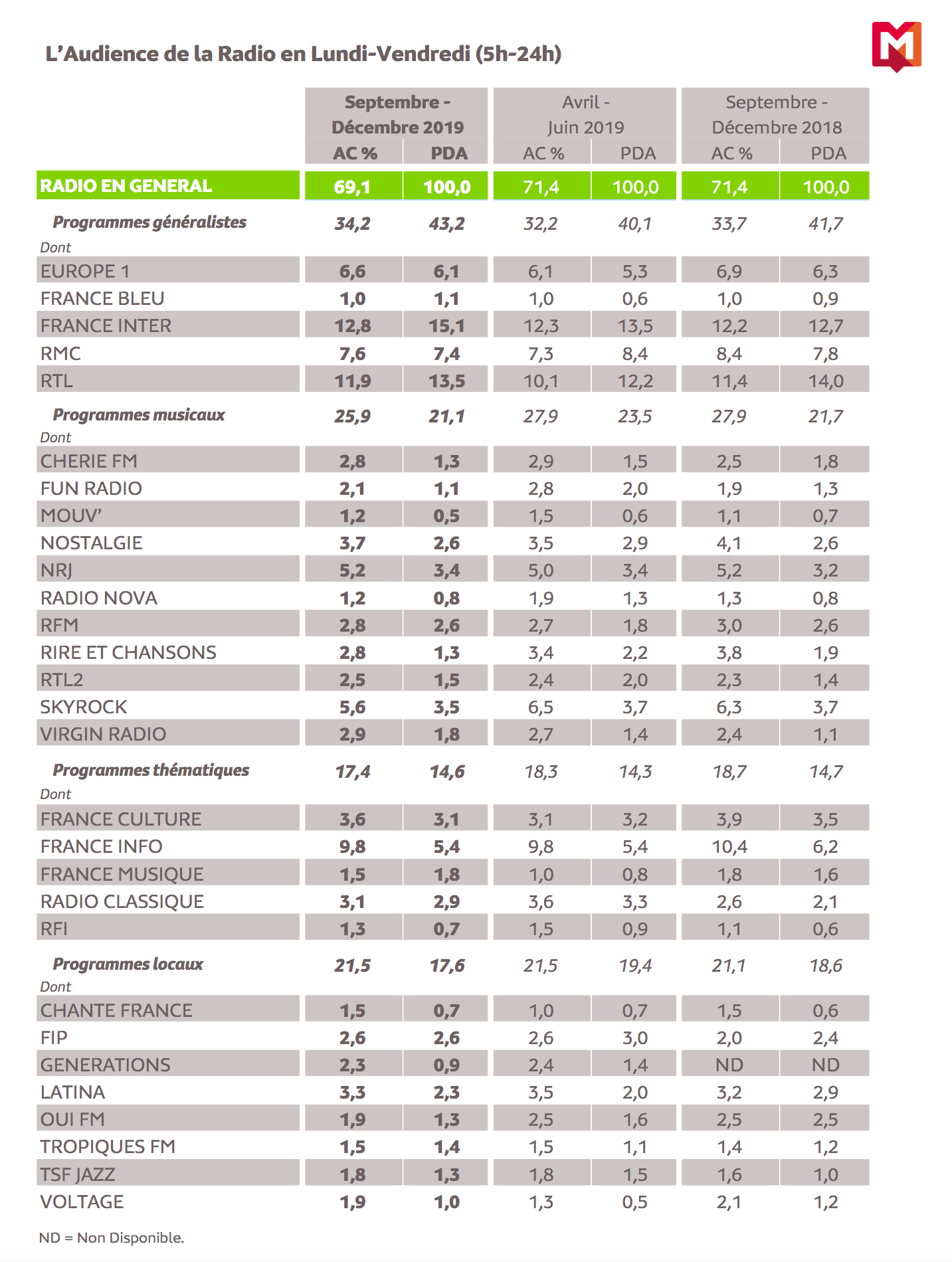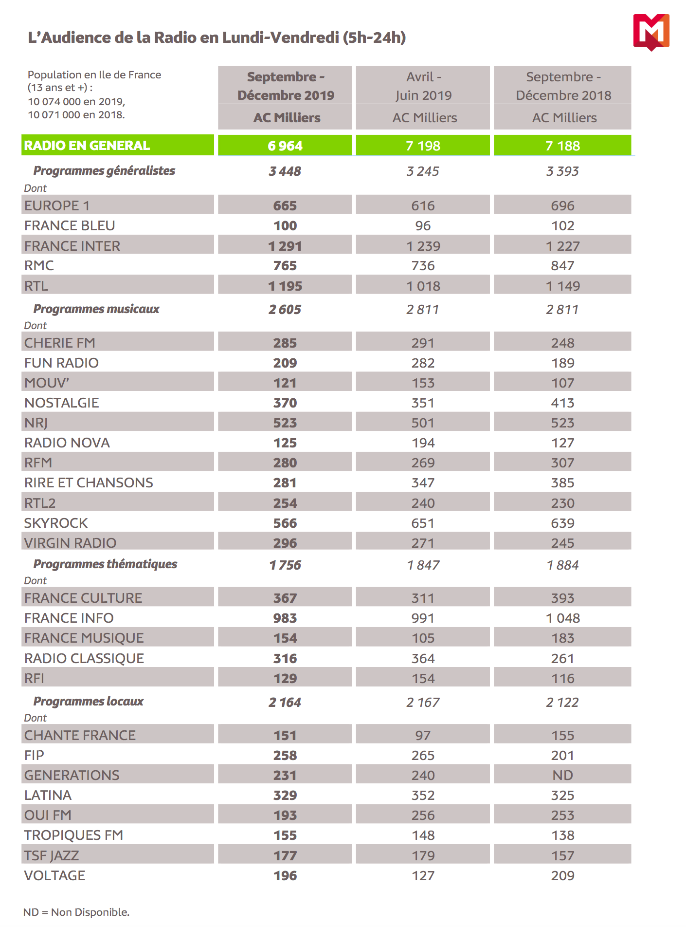 Source : Médiamétrie -126 000 Radio Ile de France -Septembre-Décembre 2019-Copyright Médiamétrie -Tous droits réservés