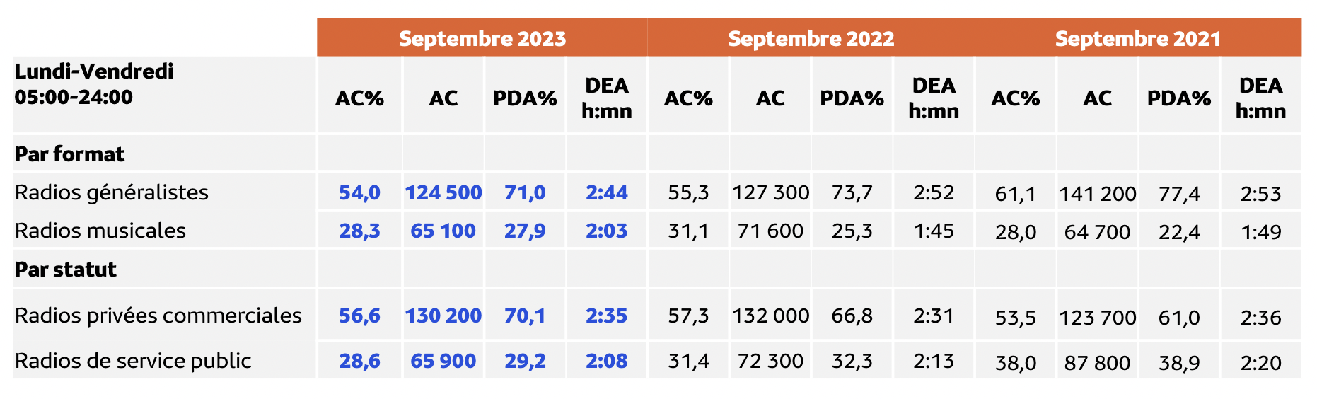 Au global, les radios généralistes génèrent 54.0% d'audience cumulée contre 28.3% pour les musicales. Les radios privées commerciales sont écoutées par 130 200 auditeurs contre 65 900 pour le service public.