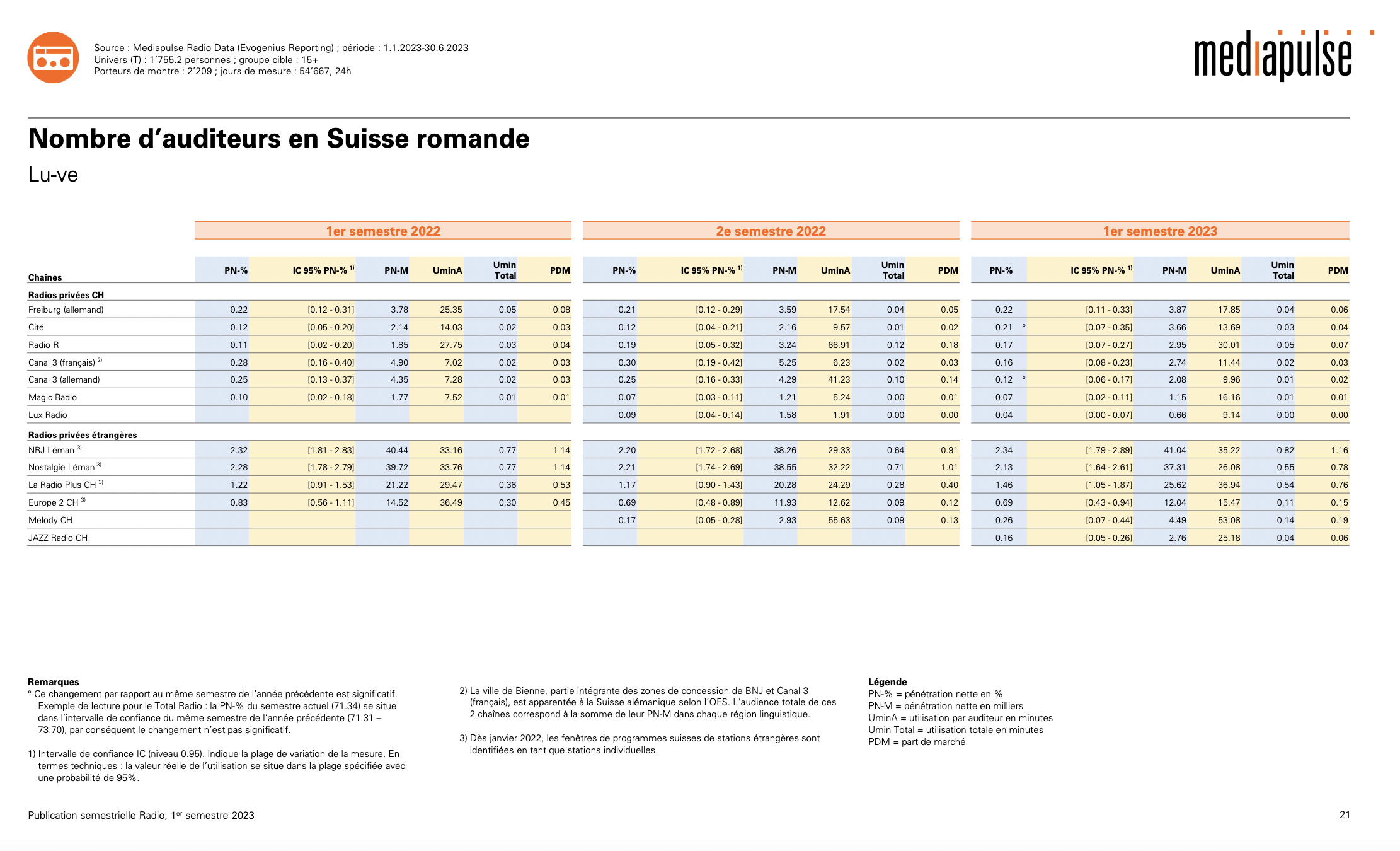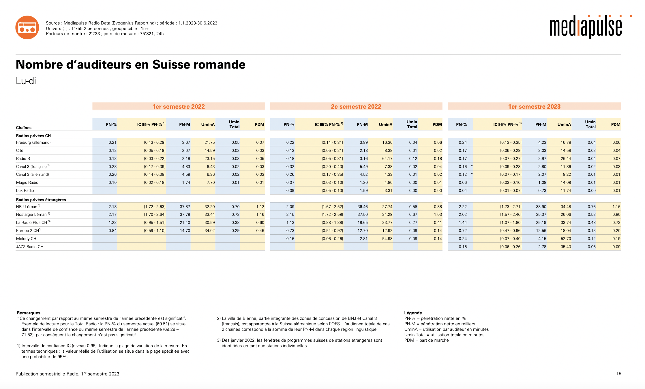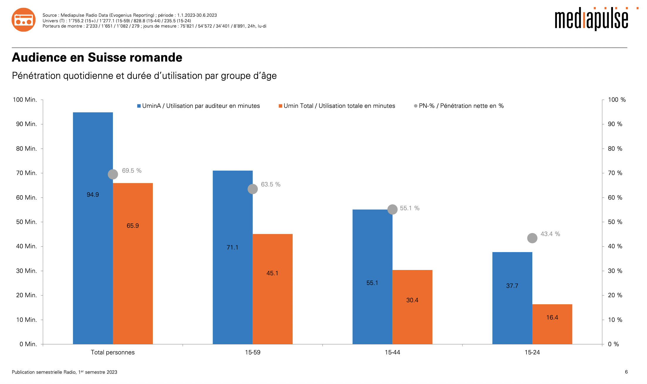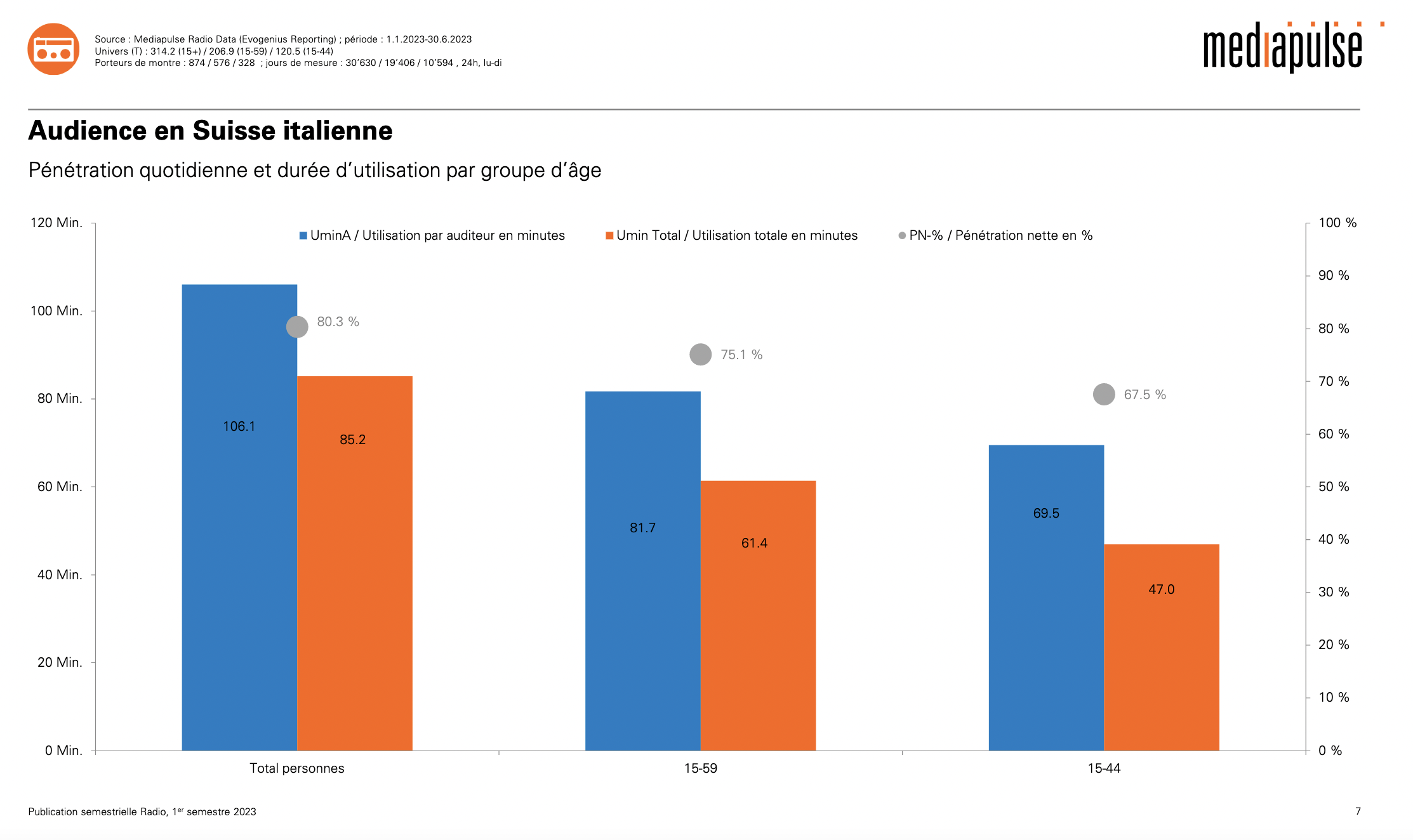 Par rapport au premier semestre 2022, la part du public radio a légèrement reculé, passant de 74 à 73% de l’ensemble de la population. La durée d’écoute a en revanche fortement augmenté, puisqu’elle est passée de 105 à 111 minutes par jour. En d’autres termes : par rapport à l’année précédente, les personnes étaient un peu moins nombreuses à l’écoute, mais l’étaient pendant nettement plus longtemps. De l’analyse par région linguistique ressort un tableau qui diffère dans chacune des trois régions : en Suisse alémanique, la pénétration a perdu un point de pourcentage pour s’établir à 74%, avec une durée d’écoute en nette hausse de 110 à 117 minutes. En Suisse romande, la pénétration est restée stable à 70% et la durée d’écoute a augmenté de six minutes, passant ainsi de 89 à 95 minutes. Enfin, en Suisse italienne, tant la pénétration que la durée d’écoute ont progressé, passant respectivement de 79 à 80 % et de 102 à 106 minutes.