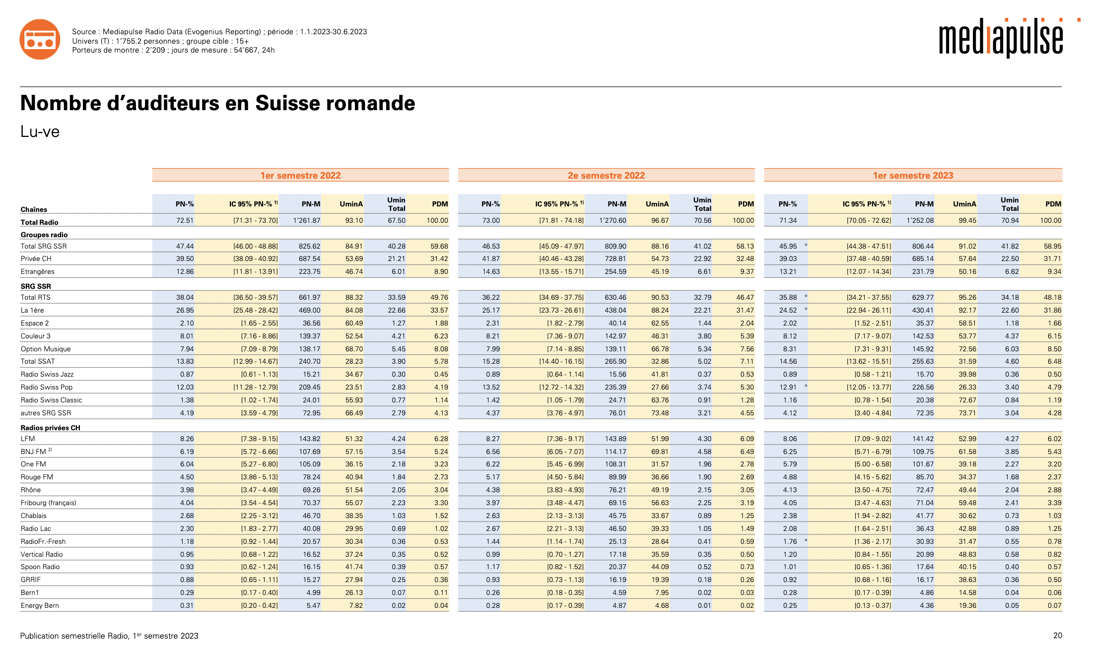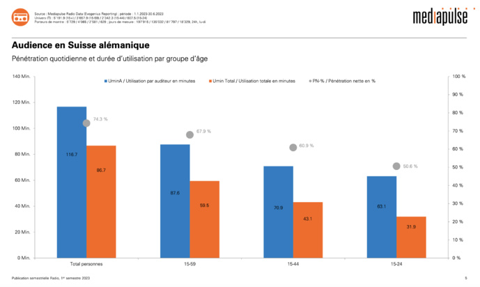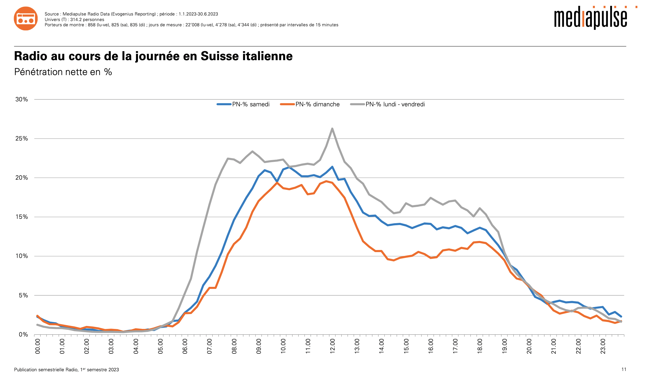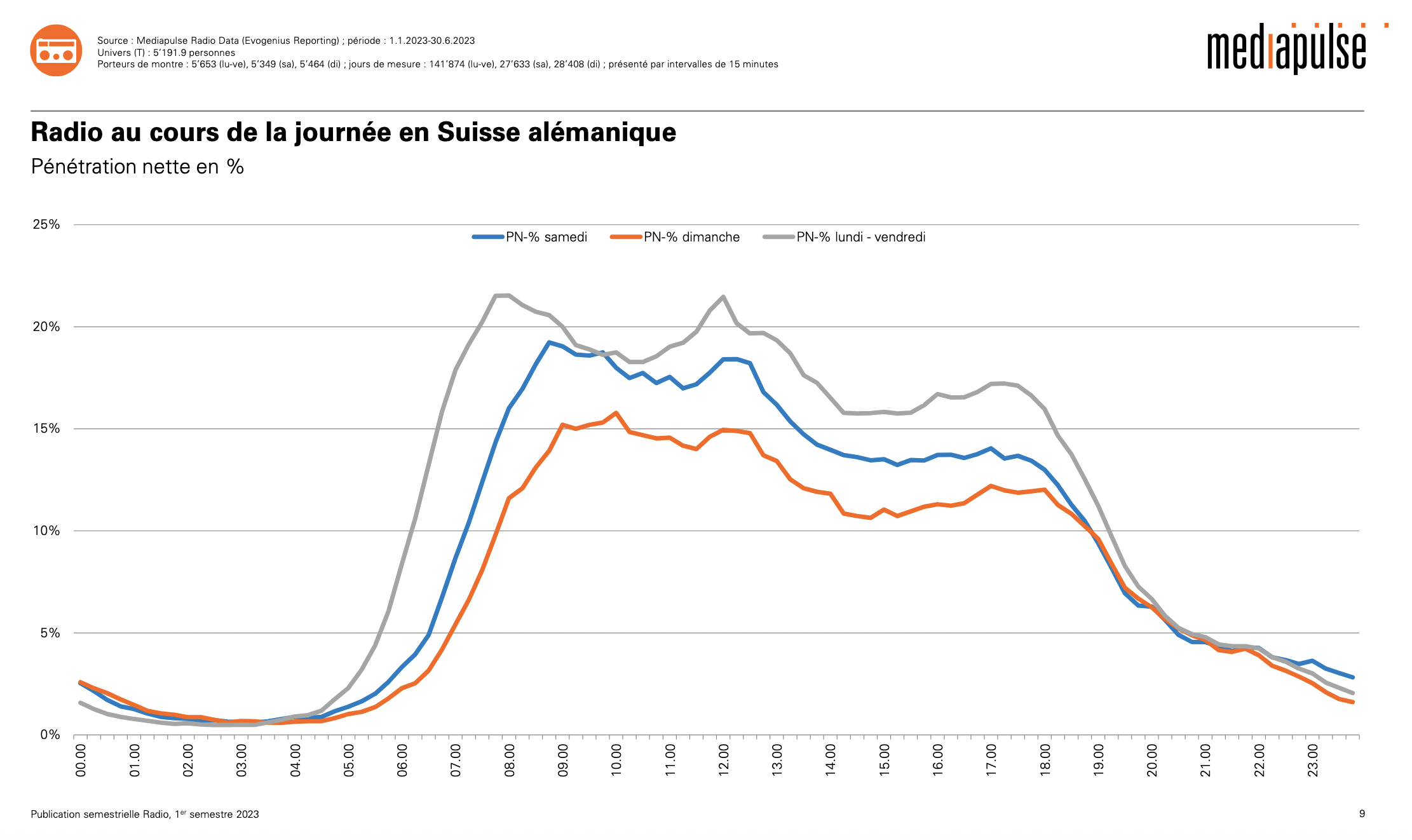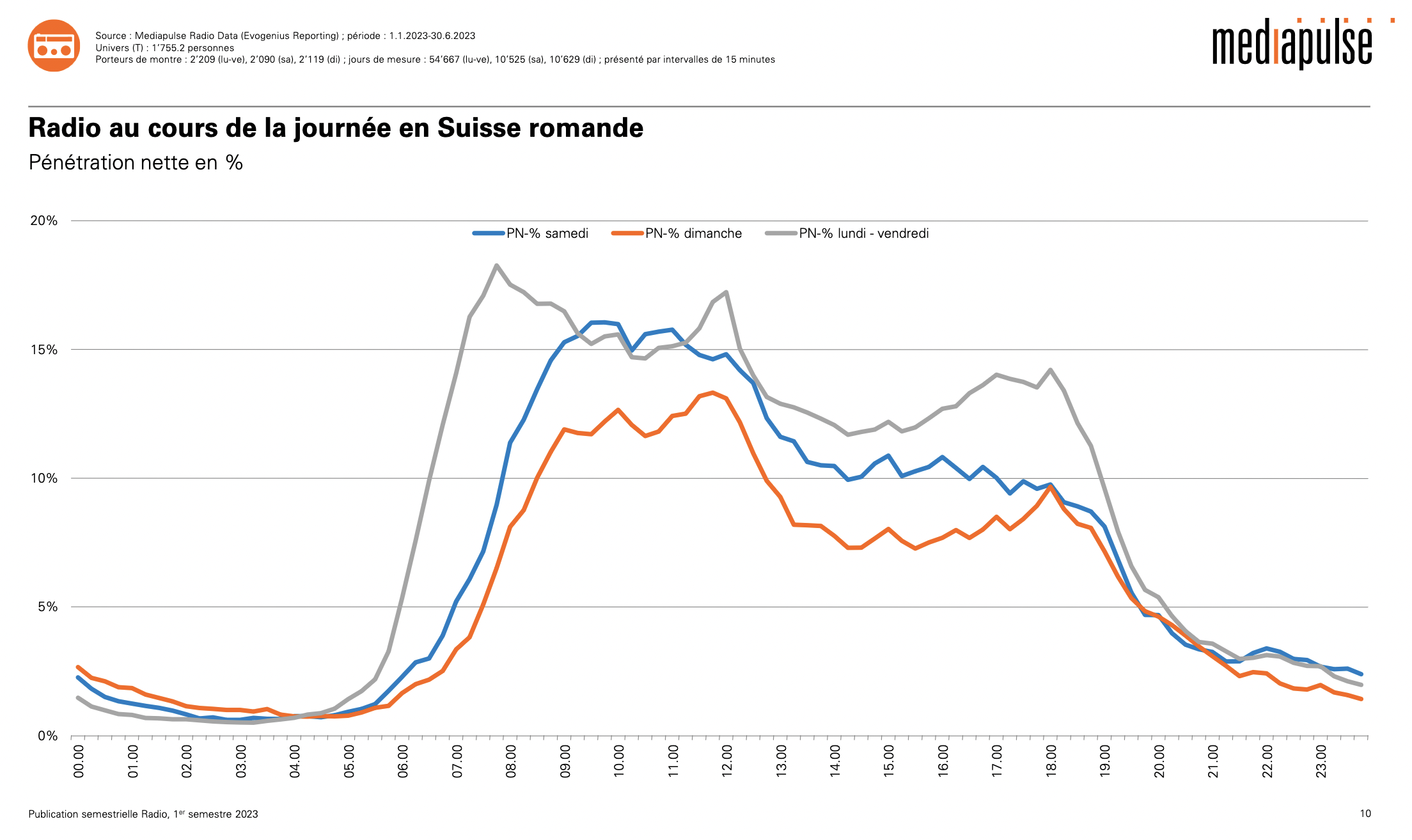 Par rapport au premier semestre 2022, la part du public radio a légèrement reculé, passant de 74 à 73% de l’ensemble de la population. La durée d’écoute a en revanche fortement augmenté, puisqu’elle est passée de 105 à 111 minutes par jour. En d’autres termes : par rapport à l’année précédente, les personnes étaient un peu moins nombreuses à l’écoute, mais l’étaient pendant nettement plus longtemps. De l’analyse par région linguistique ressort un tableau qui diffère dans chacune des trois régions : en Suisse alémanique, la pénétration a perdu un point de pourcentage pour s’établir à 74%, avec une durée d’écoute en nette hausse de 110 à 117 minutes. En Suisse romande, la pénétration est restée stable à 70% et la durée d’écoute a augmenté de six minutes, passant ainsi de 89 à 95 minutes. Enfin, en Suisse italienne, tant la pénétration que la durée d’écoute ont progressé, passant respectivement de 79 à 80 % et de 102 à 106 minutes.