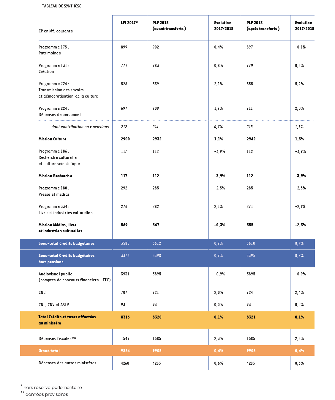 "Ce budget traduit l’engagement du Président de la République, qui a fait de la culture une priorité de son mandat" explique le ministère. Les ressources publiques affectées à l’audiovisuel public s’élèveront à 3.9 milliards d’euros, avec une économie de 36 millions par rapport à 2017, ce qui représente moins de 1% de ce budget. "Ce budget 2018 est un budget de transformation", a indiqué Françoise Nyssen. "La politique culturelle a besoin d’un nouvel élan. Nous allons l’impulser, dès cette année".