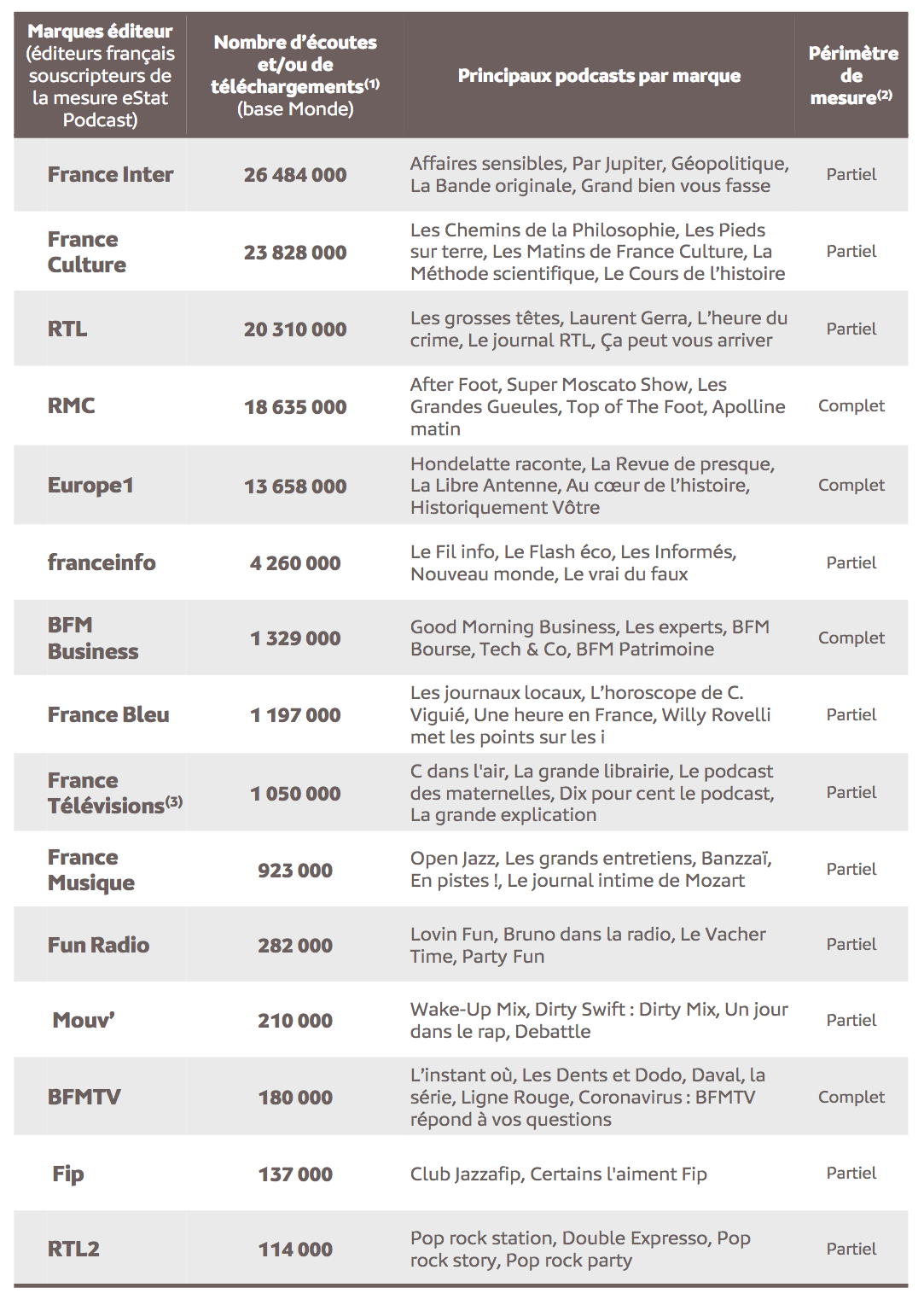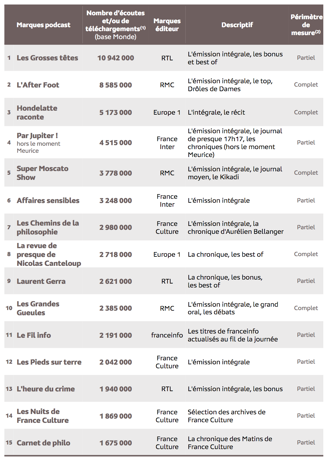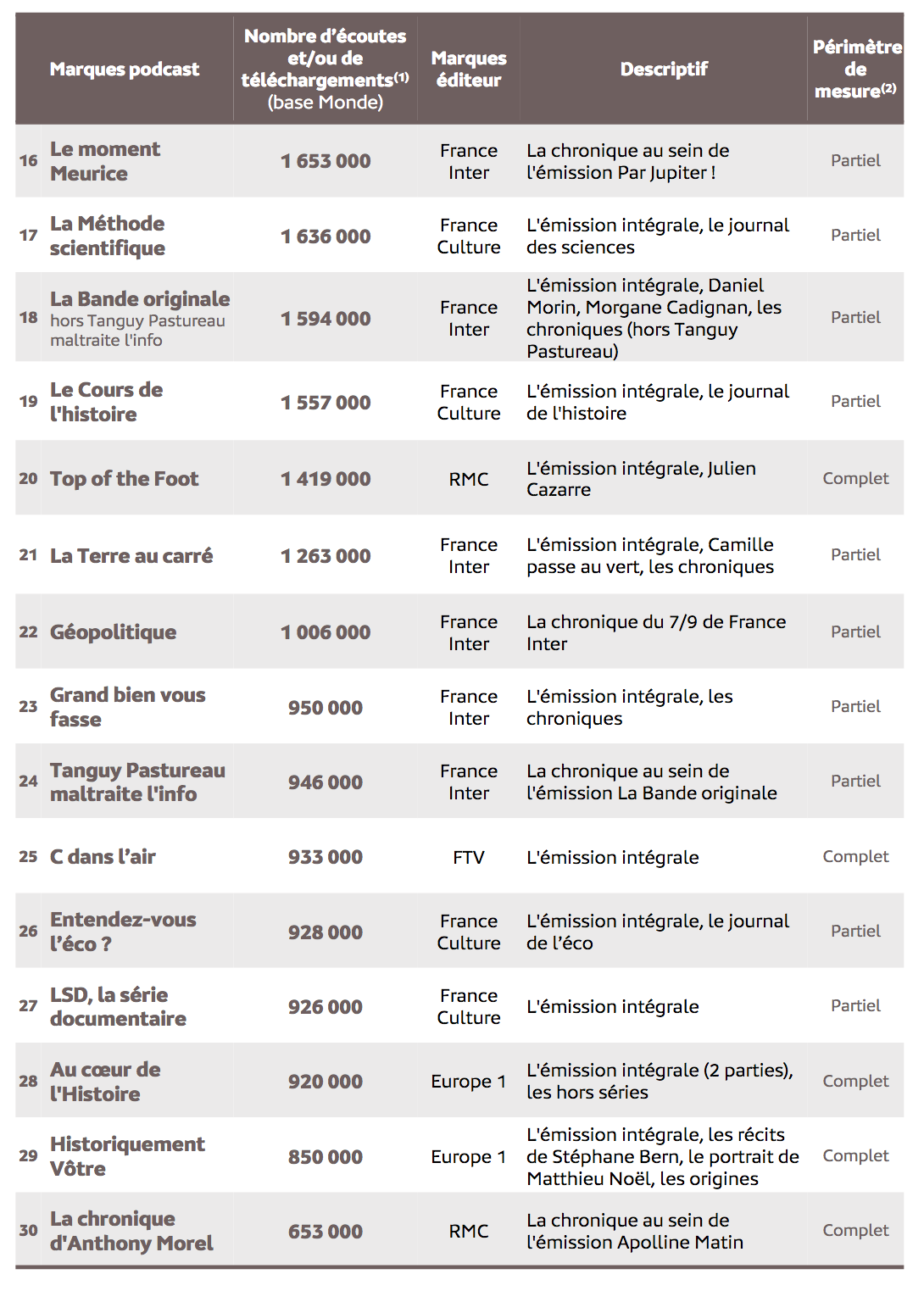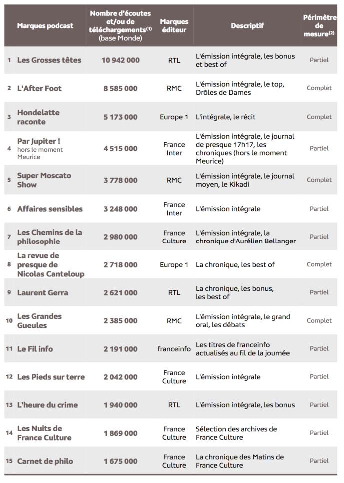 Peu de podcast natifs dans ce classement mais beaucoup de replays. Ce sont principalement des émissions issues des grilles que l'on retrouve parmi ces podcasts mesurés par Médiamétrie. On retrouve ainsi, et sans surprise, la quasi totalité des émissions les plus emblématiques. Cette mesure eStat Podcast comptabilise "l’ensemble des contenus audio écoutés directement en streaming ou téléchargés sur la majorité des supports d’écoute (plateformes, sites, applications…). Les indicateurs sont établis à partir de la technologie site-centric" rappelle Médiamétrie. "Cette technologie consiste à intégrer un tag placé dans le lien de téléchargement et n’ayant pas d’incidence sur l’expérience utilisateur. Des filtrages sont effectués chaque mois afin d’exclure les téléchargements abusifs".