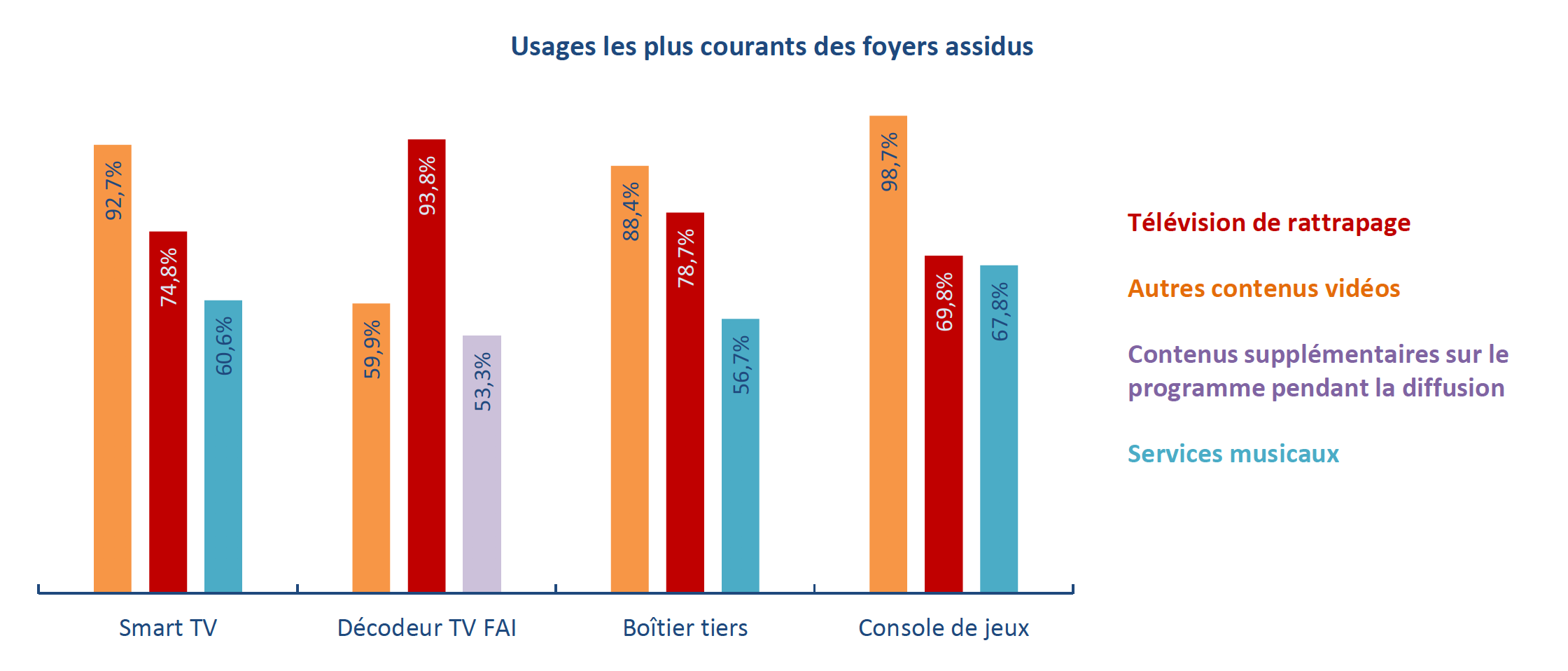 Comme les écrans alternatifs, le téléviseur peut être connecté : ainsi, au premier semestre 2018, 77 % des foyers disposent d’un téléviseur connecté à internet, directement par la Smart TV (33 % des foyers équipés en téléviseur(s) connecté(s)) ou indirectement, par le décodeur TV des FAI (79 %), la console de jeux (37 %) ou un boitier tiers (18 %). La télévision de rattrapage est l’usage connecté dominant depuis le décodeur TV des FAI. Depuis les autres modes de connexion, des contenus comme la vidéo à la demande sont le plus souvent regardés.