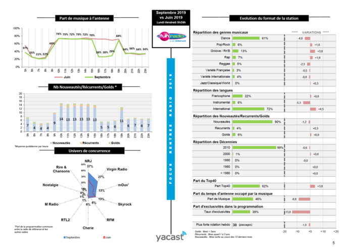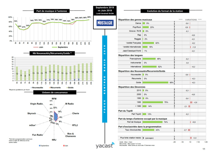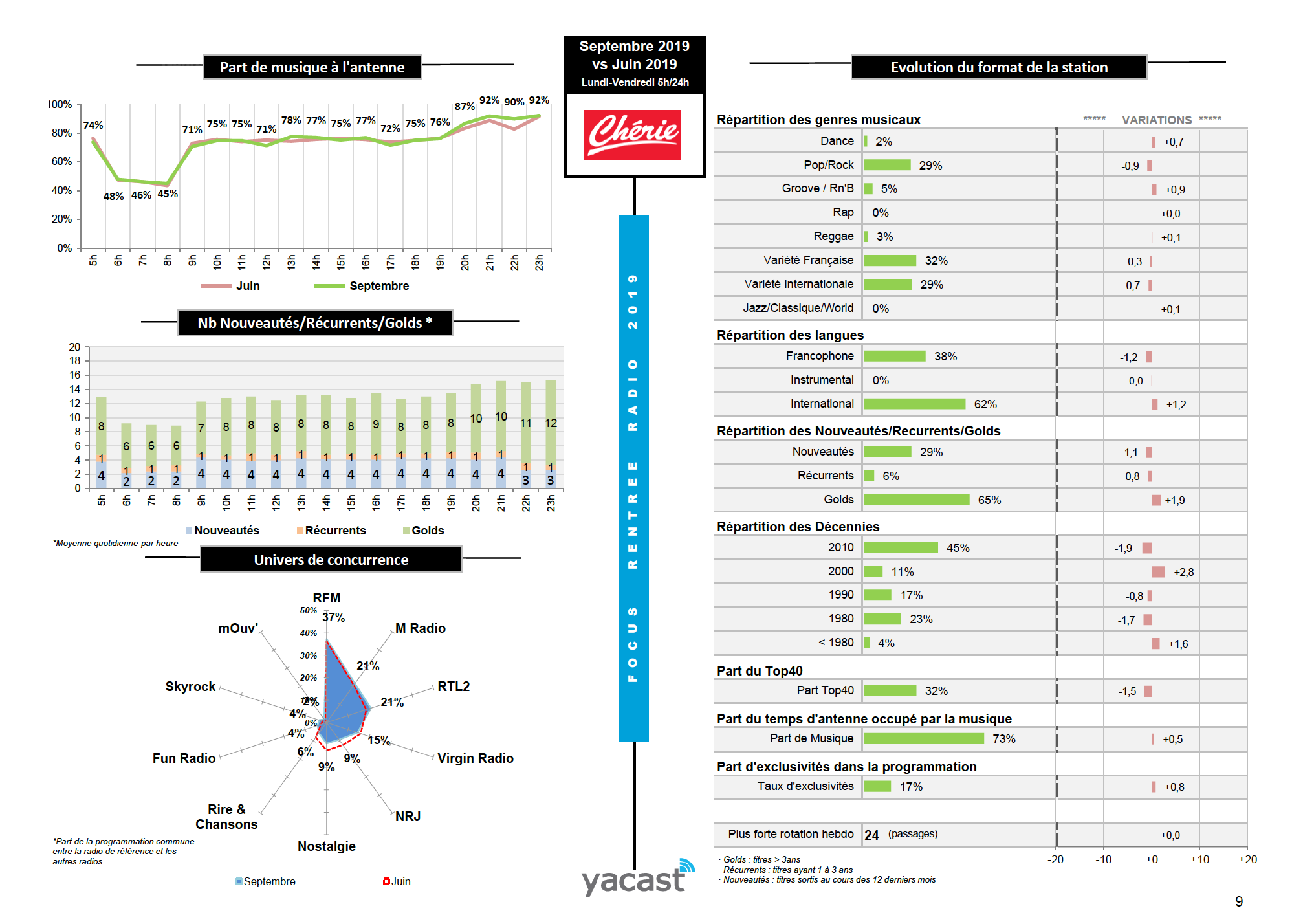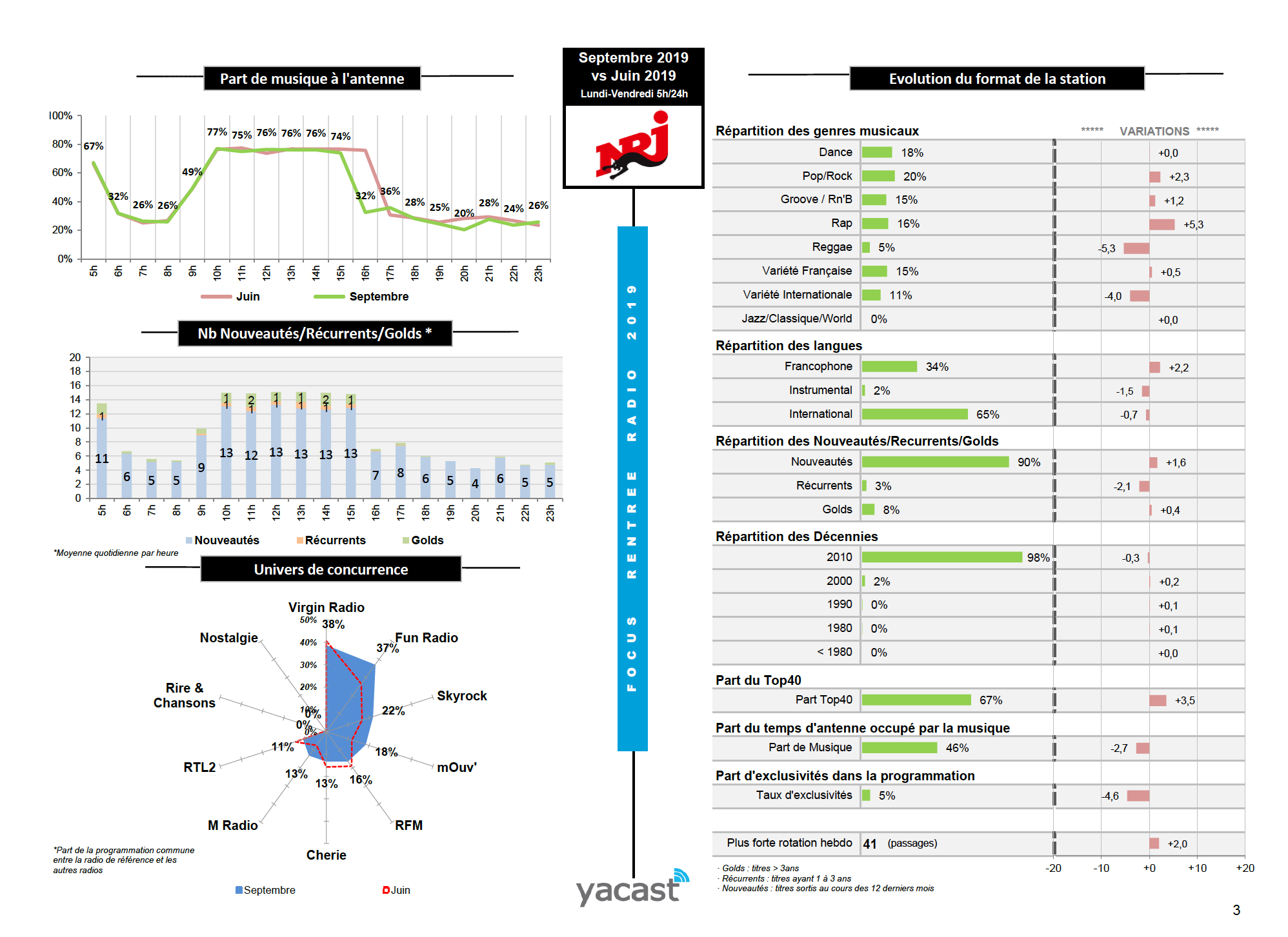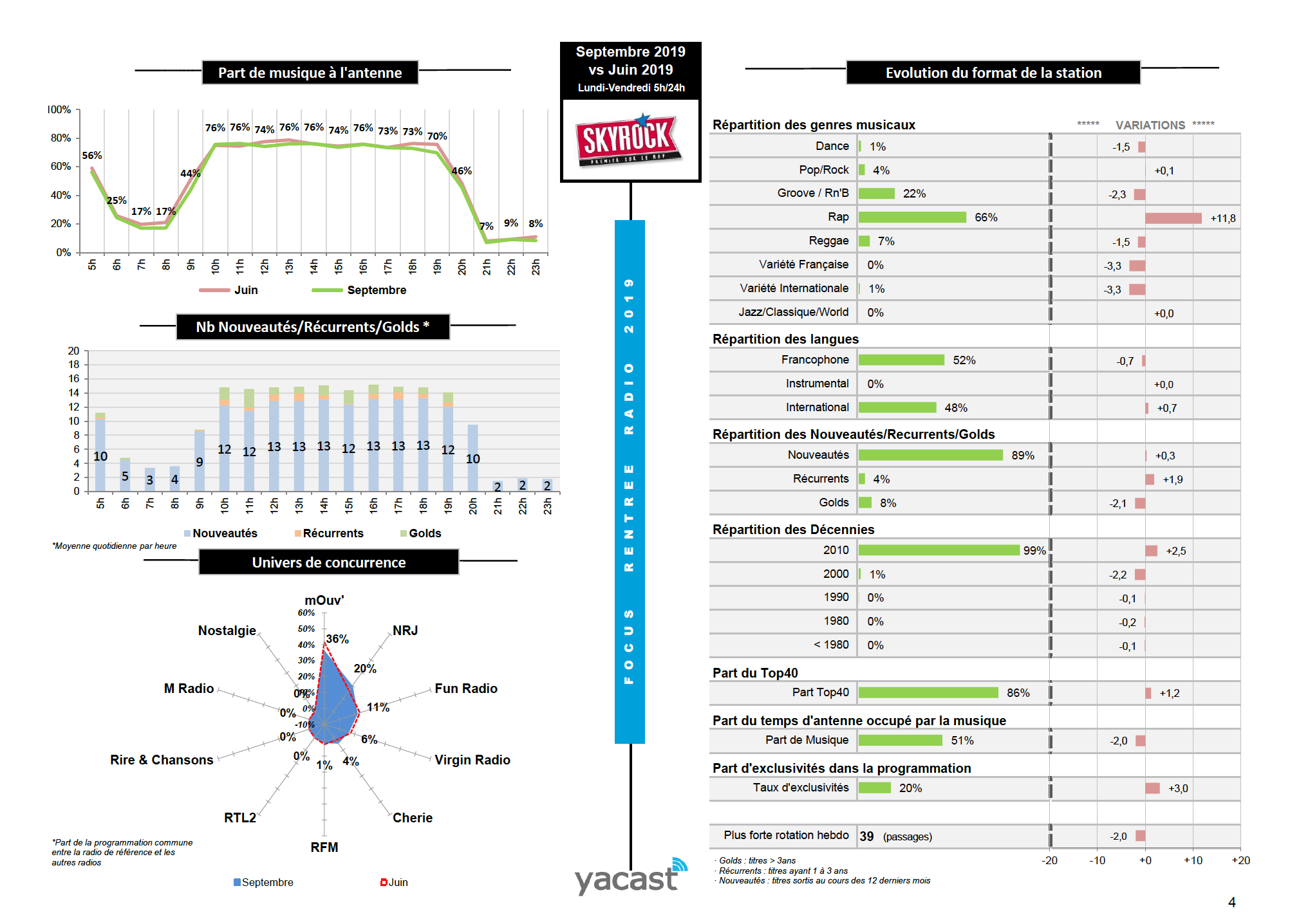 Sur Skyrock, la part du temps d'antenne occupé par la musique a été de 51%. Le rap est forcément le genre musical le plus représenté puisqu'il atteint 66%. Fun Radio a diffusé 90% de nouveautés (6% de Golds et 4% de titres récurrents). La programmation de Virgin Radio a été international à hauteur de 74% en septembre. Et, sans surprise, la programmation musicale de Nostalgie est constituée par 95% de Golds.