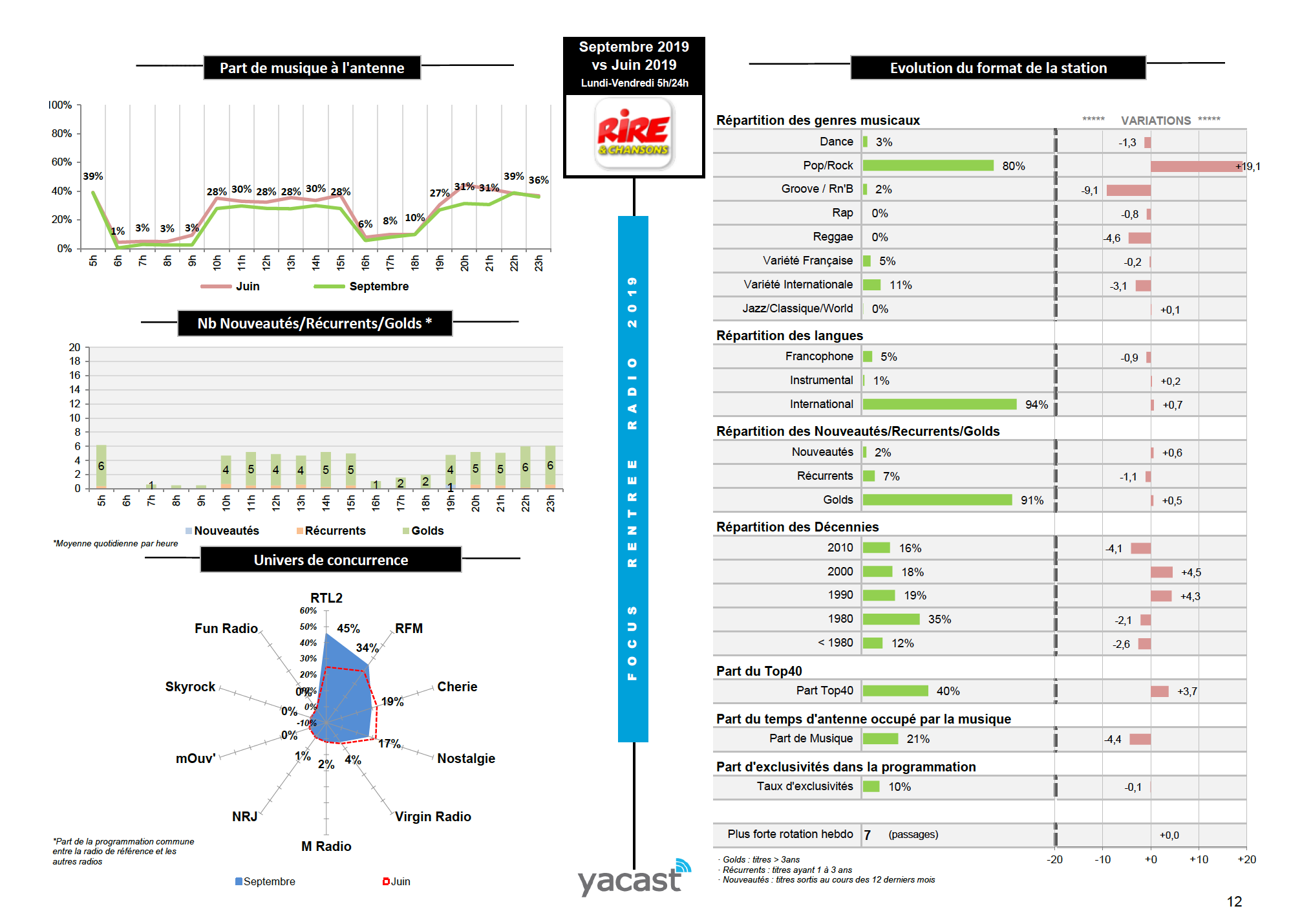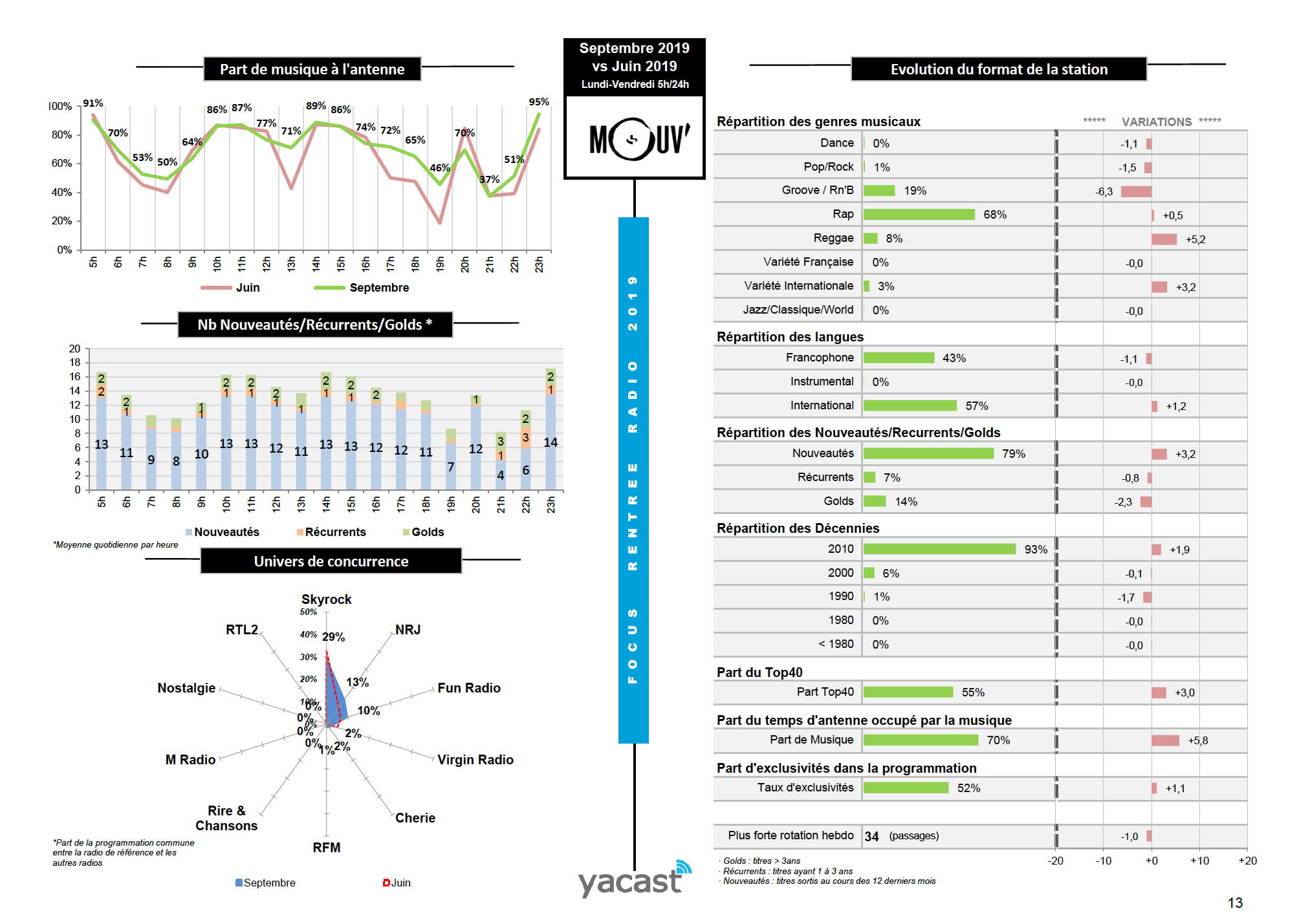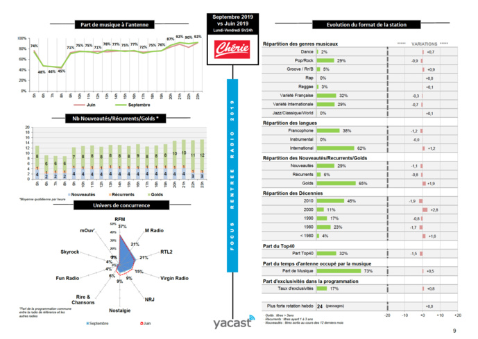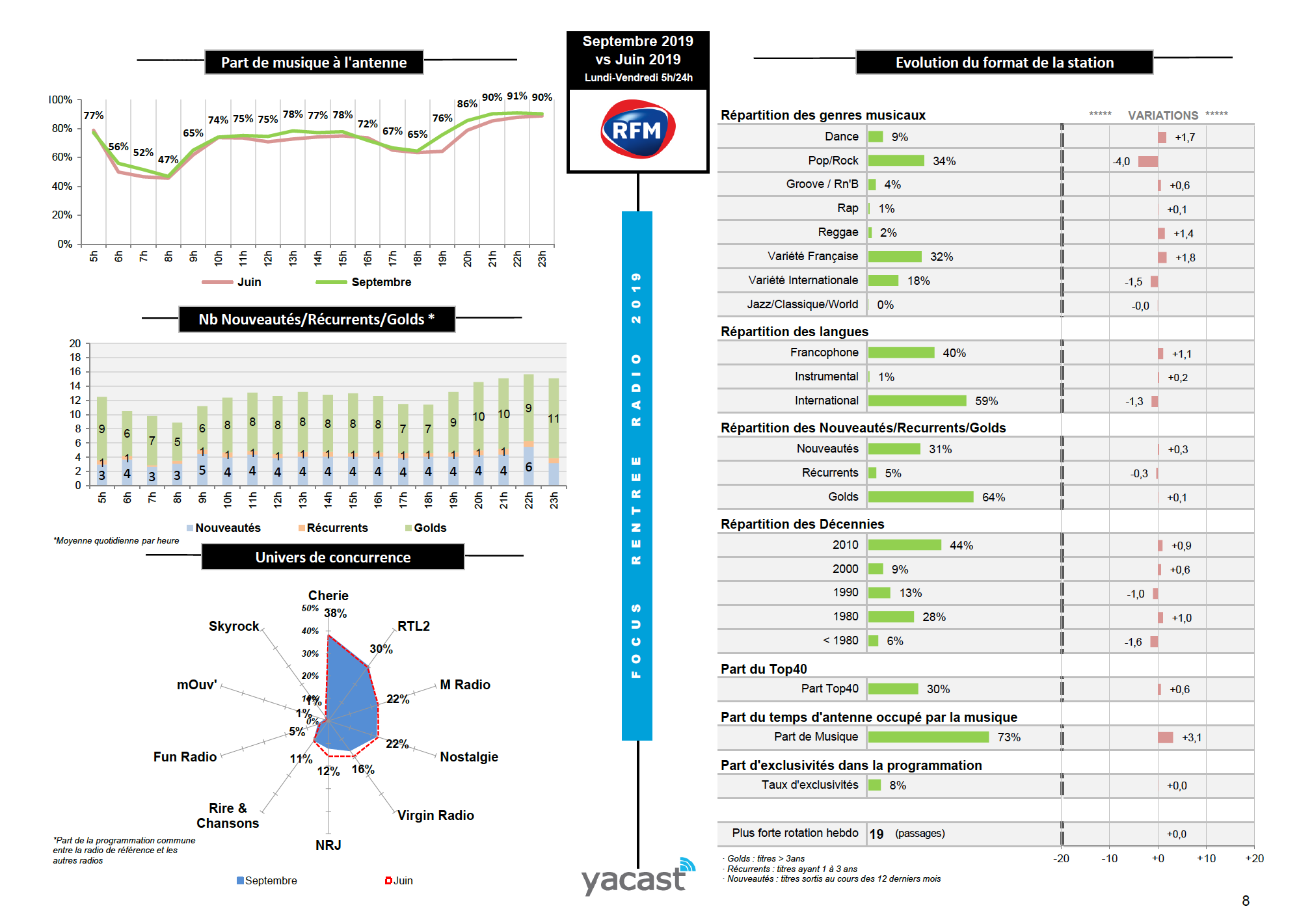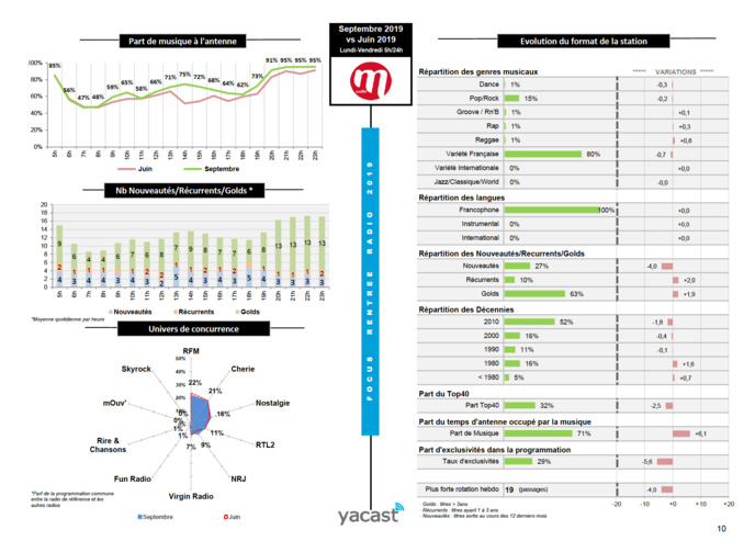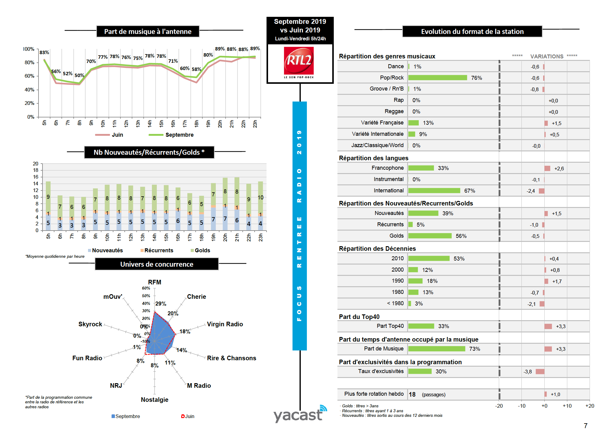 Sur Skyrock, la part du temps d'antenne occupé par la musique a été de 51%. Le rap est forcément le genre musical le plus représenté puisqu'il atteint 66%. Fun Radio a diffusé 90% de nouveautés (6% de Golds et 4% de titres récurrents). La programmation de Virgin Radio a été international à hauteur de 74% en septembre. Et, sans surprise, la programmation musicale de Nostalgie est constituée par 95% de Golds.