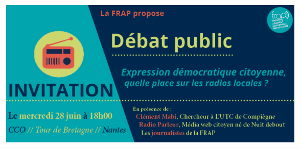 Clément Mabi, chercheur à l’Université de Technologie de Compiègne en Communication politique, spécialiste des questions d'expérimentation démocratique, participera à ce débat public aux côtés de journalistes des radios associatives des Pays de la Loire et de l'équipe de Radio Parleur, un "média web sonore" qui se veut la voix de la rue et des mouvements citoyens, né de Radio Debout à Paris, Place de la République pendant Nuit Debout.