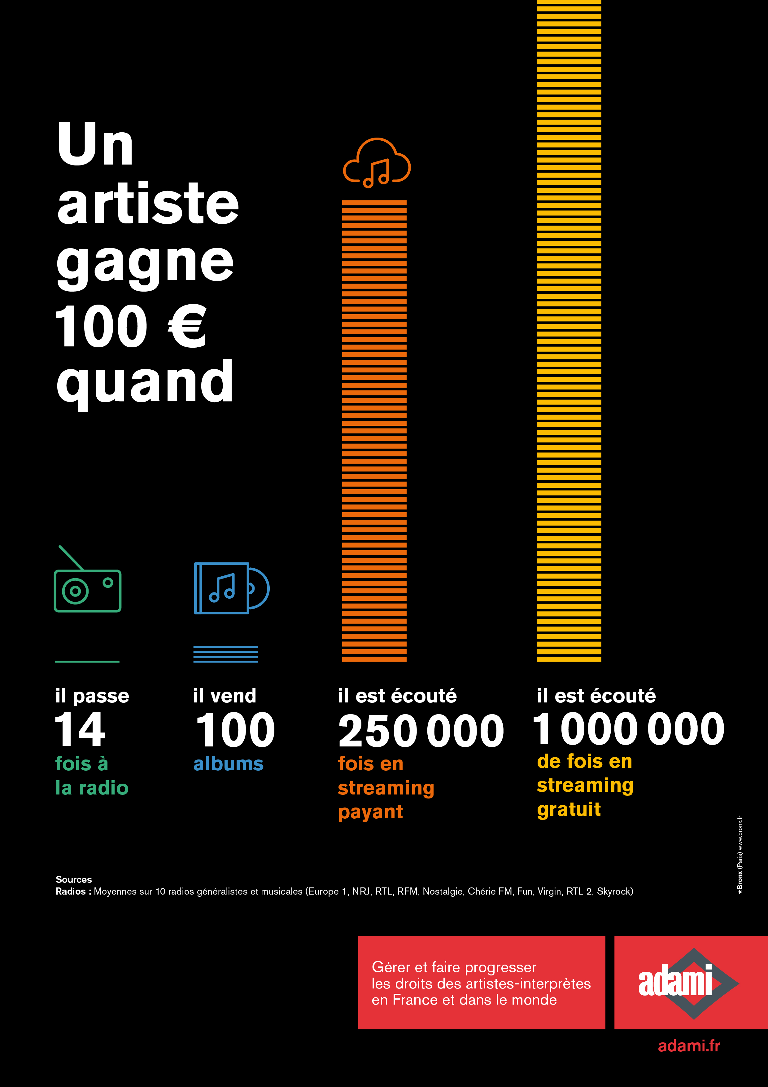 L'Adami propose un nouvel éclairage sur la rémunération des artistes. A partir des données de marché de la musique et des droits Adami des artistes-interprètes au titre de la radio, cette analyse compare leurs revenus à partir des principaux usages de la musique enregistrée. Cette infographie fait suite à celle démontrant que l’ensemble des artistes se partage 0,46 € pour un abonnement au streaming à 9,99 € / mois.Brulhatour est le rédacteur en chef du magazine La Lettre Pro de la Radio et le directeur associé... En savoir plus sur cet auteur