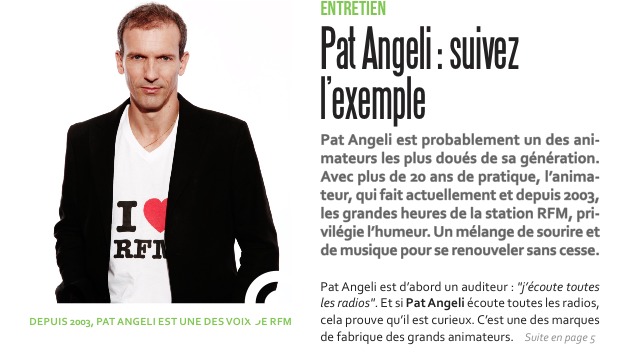 Pat Angeli est d’abord un auditeur : "j’écoute toutes les radios". Et si Pat Angeli écoute toutes les radios, cela prouve qu’il est curieux. C’est une des marques de fabrique des grands animateurs. Mais la lassitude demeure le risque qui peut s’installer au bout de toutes ces années et pire, la répétitivité dans l’oreille de l’auditeur. Et Pat Angeli en est conscient. "C’est là toute la difficulté pour un animateur de flux contrairement aux animateurs de libre antenne ou des Mornings. Même si l’on diffuse souvent les mêmes disques, il ne faut pas donner cette impression de répétitivité. Il faut accompagner l’auditeur. Comprenez que celui-ci n’est pas là pour Pat Angeli mais d’abord pour la musique de RFM". Apporter un plus ou une humeur fait toujours la différence : "contrairement à ce que certains peuvent dire, c’est un métier alors ce n’est pas aussi facile que ça". Pat Angeli avoue avoir beaucoup de chance d’exercer cette profession : "oui et j’espère que cela se ressent à l’antenne. J’y mets toute ma fraicheur".