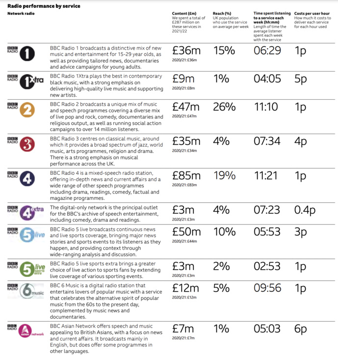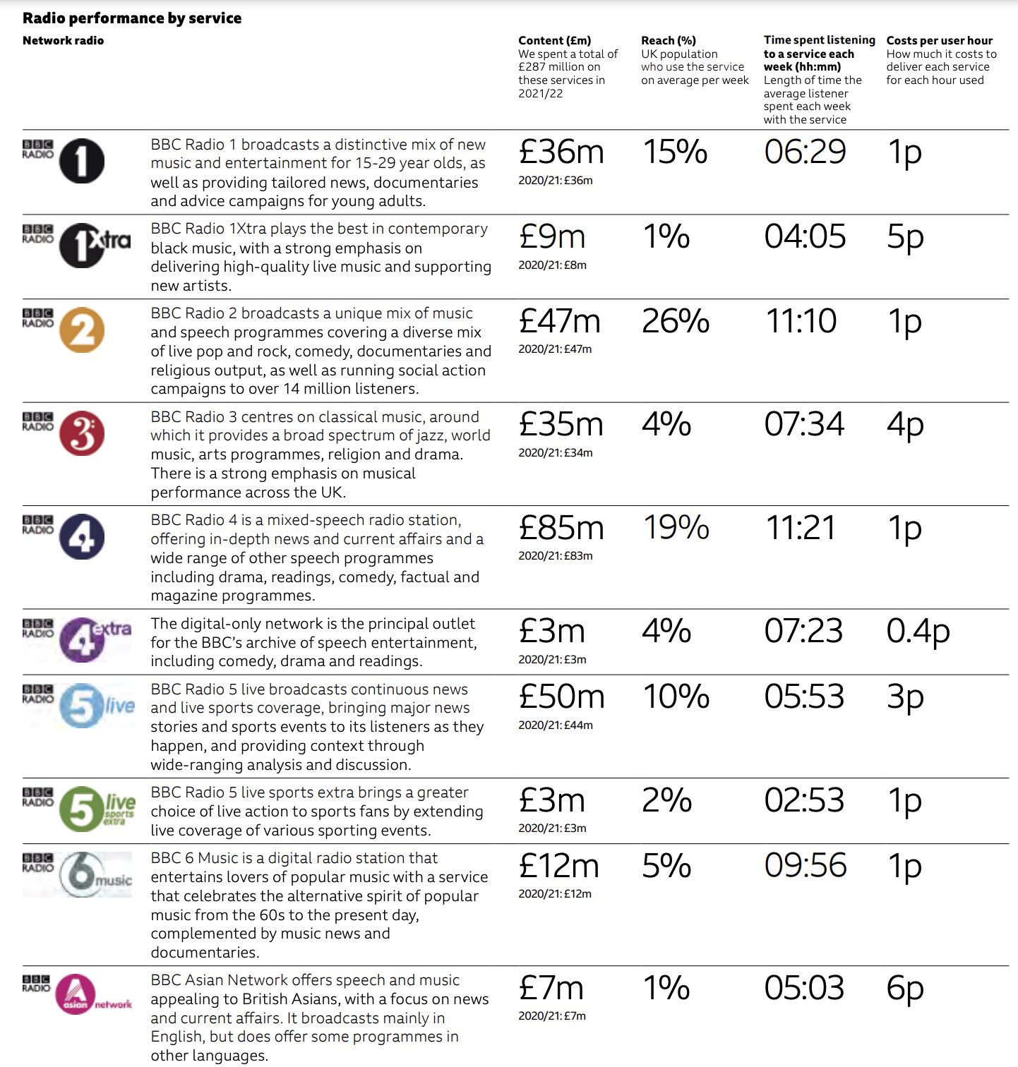 Dans le secteur de l'audio, des millions de personnes utilisent pourtant les services de la BBC : 62% des adultes écoutent la BBC Radio en moyenne chaque semaine, devant tout autre fournisseur audio. BBC iPlayer a enregistré des audiences record avec 6.6 milliards de flux, en hausse de 8%, et BBC Sounds a généré 1.54 milliard d'écoutes de radio, de musique et de podcasts au Royaume-Uni, en hausse de 23%. Par ailleurs, BBC News demeure "la source d'information la plus fiable et le premier endroit vers lequel le public britannique se tourne pour une couverture médiatique des événements majeurs". Cette année, un nombre record de personnes se sont branchées sur la couverture de la guerre en Ukraine par la BBC à l'échelle mondiale.