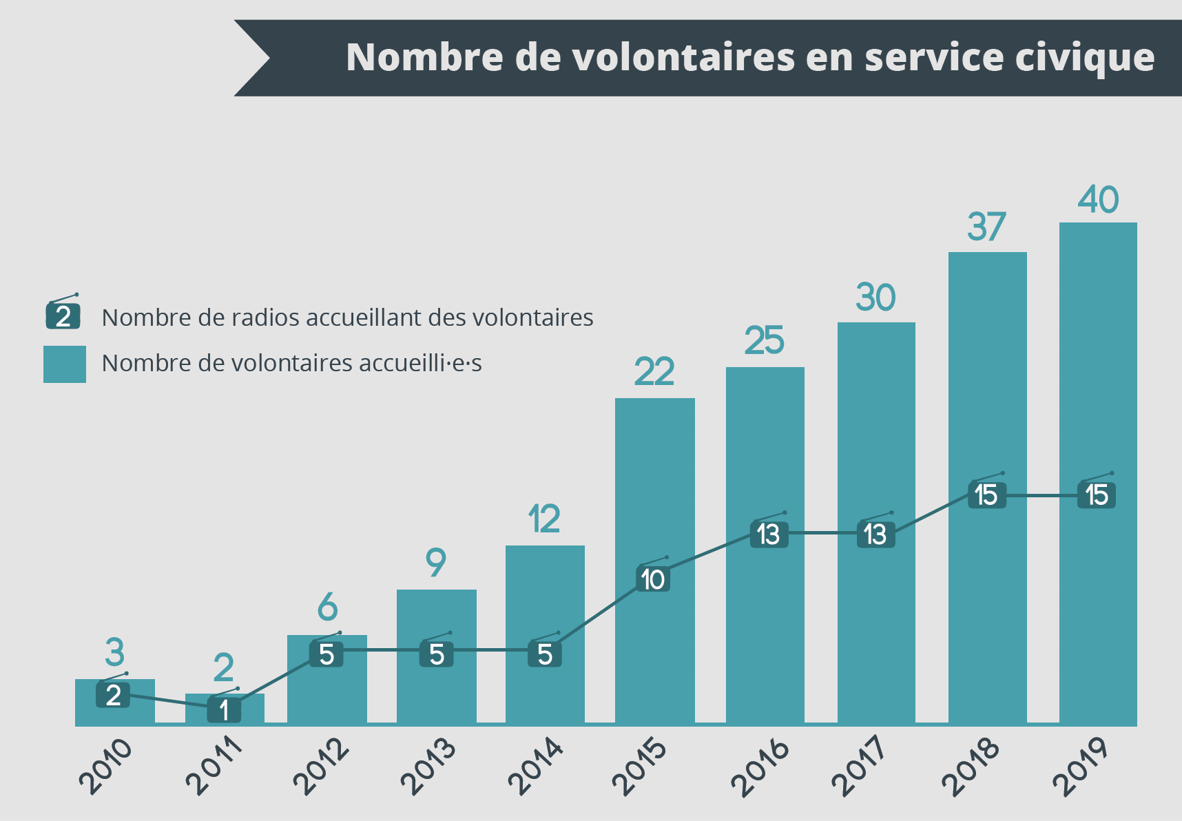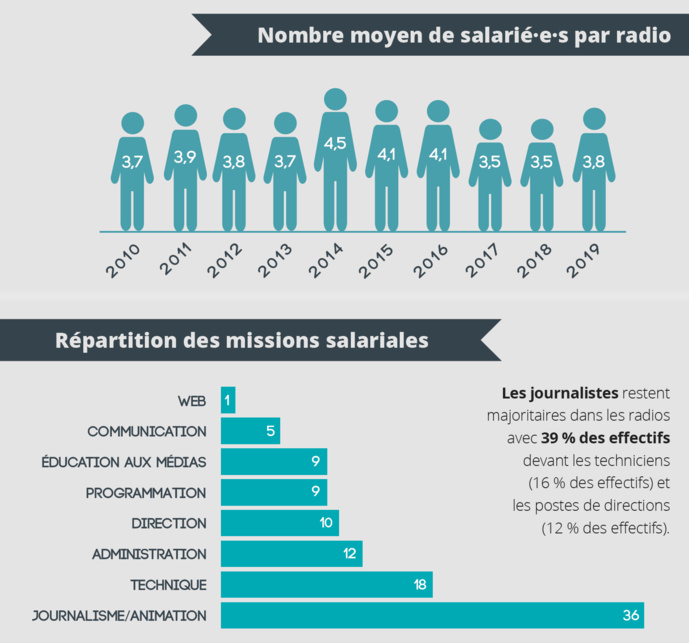 Désormais, les radios de la FRAP pèsent 1 480 bénévoles, 84 salariés (dont 73 ETP) et 40 volontaires en service civique : "Des chiffres globalement en hausse, liés notamment à l’arrivée d’une nouvelle radio dans le réseau : Radio Kerné". En totalité , il y a 84 salariés dont 37 (44%) femmes et 47 hommes (56%). La parité n’est pas atteinte. Le nombre de volontaires en service civique au sein de la FRAP ne cesse d’augmenter depuis 2010. En 2019, 15 radios de la FRAP ont engagé 40 volontaires.