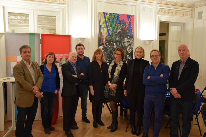 Le jury radio 2016, avec de gauche à droite, Rémi Bouquet-des-Chaux (Directeur de la Fondation Varenne), Annabelle Wanecque (Journaliste à France Bleu Tourraine et lauréate 2015), Bruno Denaes (Médiateur à Radio France), Frédéric Pommier (Journaliste à France Inter et lauréat 2015), Isabelle Chenu (Rédactrice en chef culture à RFI), Isabelle Poiraudeau (Secrétaire générale de la rédaction à Europe 1), Catherine Mangin, présidente du jury 2016 (Directrice de l'information à RTL), Philippe Antoine (Directeur de la rédaction RMC) et Yann Carpier (journaliste) © Fondation Varenne