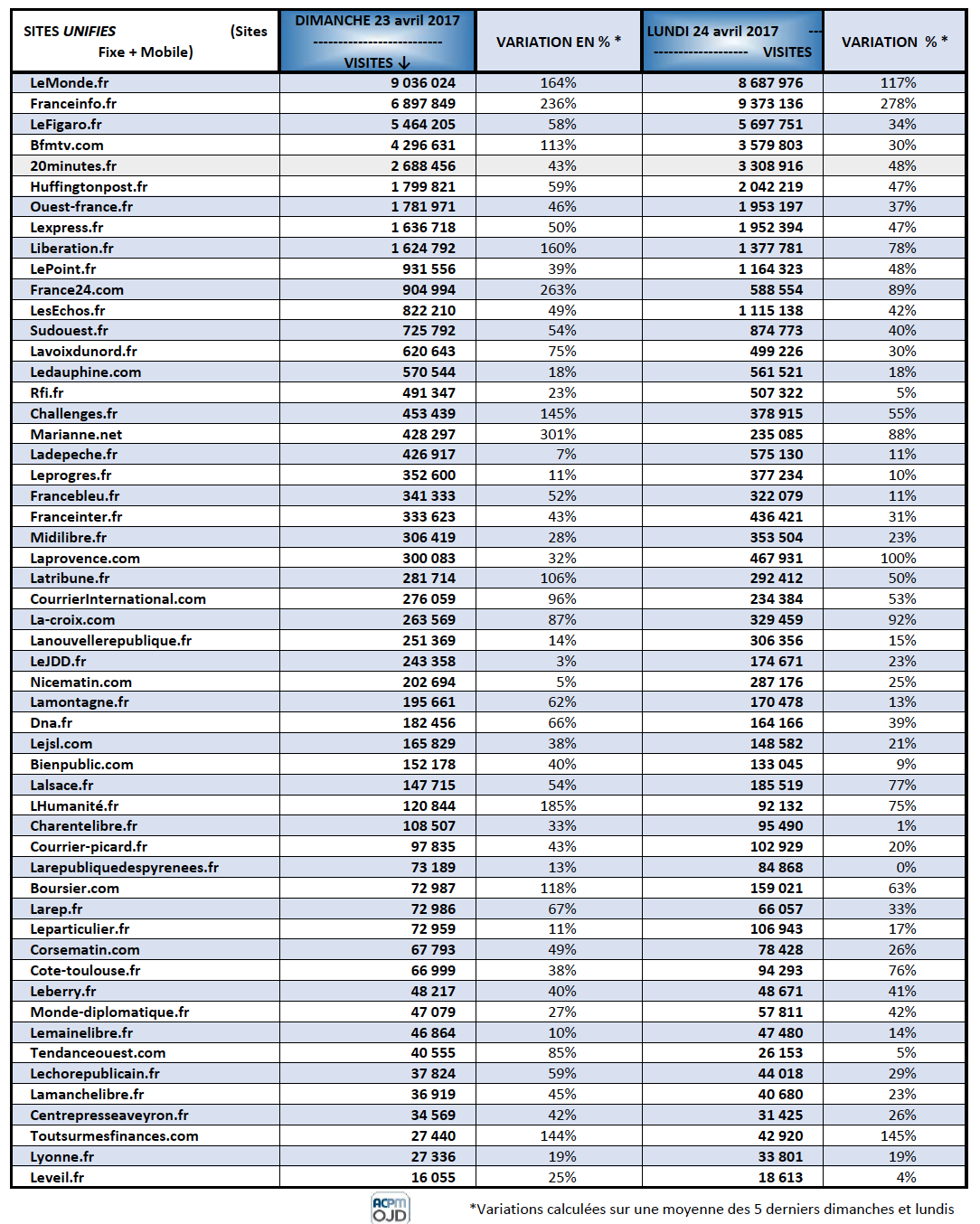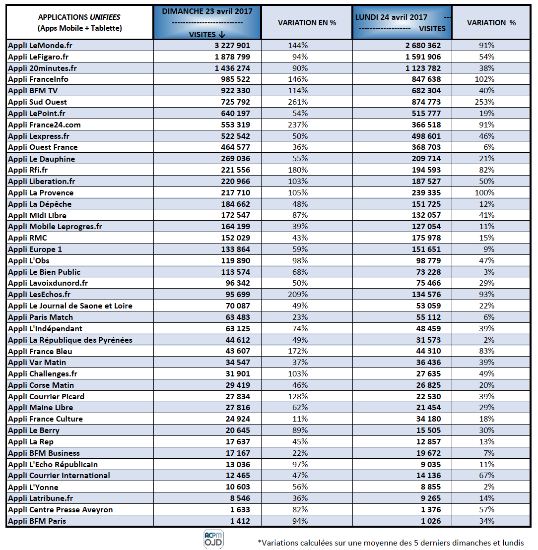 Cette fois-ci, l'ACPM propose un classement de l'audience de l'ensemble des sites et des applications d’actualités ayant progressé en nombre de visites durant la journée du dimanche d'élection (le 23 avril) et le lundi suivant (le 24 avril) en comparaison à un jour moyen (comparaison à la moyenne en visites des 5 dimanches et 5 lundis précédents).