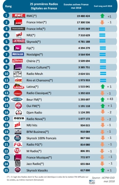 Les chiffres publiés sont le reflet de la diffusion globale d'une radio sur le web, tous types de diffusion numérique confondus (smartphone, PC, tablette, TV connectée, box internet, transistor numérique, autoradio connecté, agrégateurs de flux, etc.).