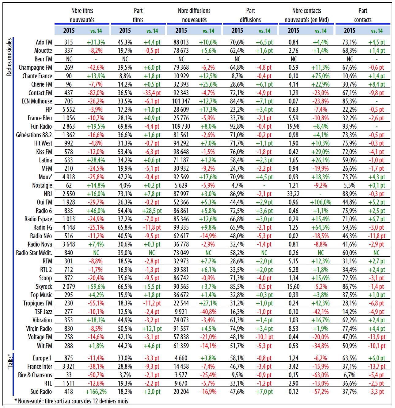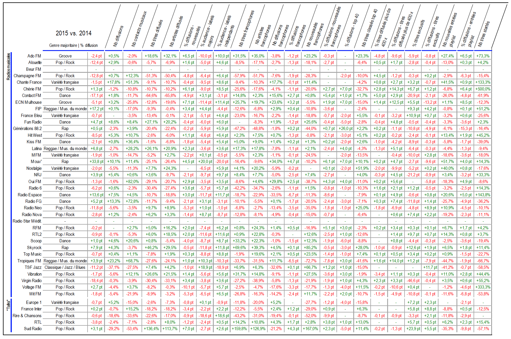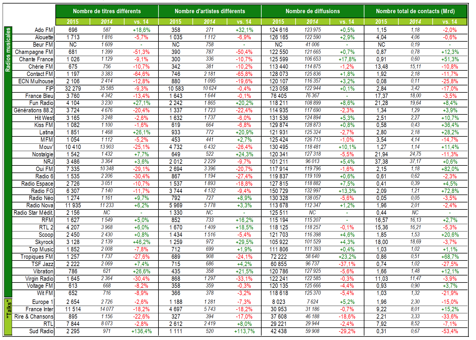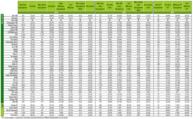 "Si les incidents de pige observés en 2015, ainsi que les changements de stratégie de programmation de certaines stations n’affectent qu’à la marge la donne consolidée en termes de diffusions (-0,2%), en revanche - combinés à la baisse dont participe un grand nombre de stations - leur impact est réel sur l’ensemble des indicateurs de la diversité et de la francophonie : titres (-10,2%), titres francophones (-8,3%), artistes (-10,9%), artistes francophones (-8,1%), nouveautés (-14,3%), nouveautés francophones (-6,5%)" explique l'Observatoire de la Musique.