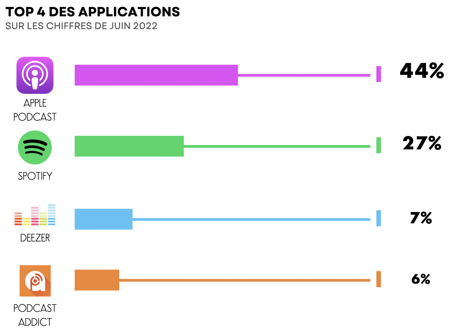Les 3 plus importantes thématiques en nombre de téléchargements représentent 50% des écoutes podcasts. Ce sont les catégories "Culture et société", "Éducation" et "Actualités". Les catégories "Humour", "Sciences", "Affaires", "Sports" et "Criminologie" complètent ce classement.