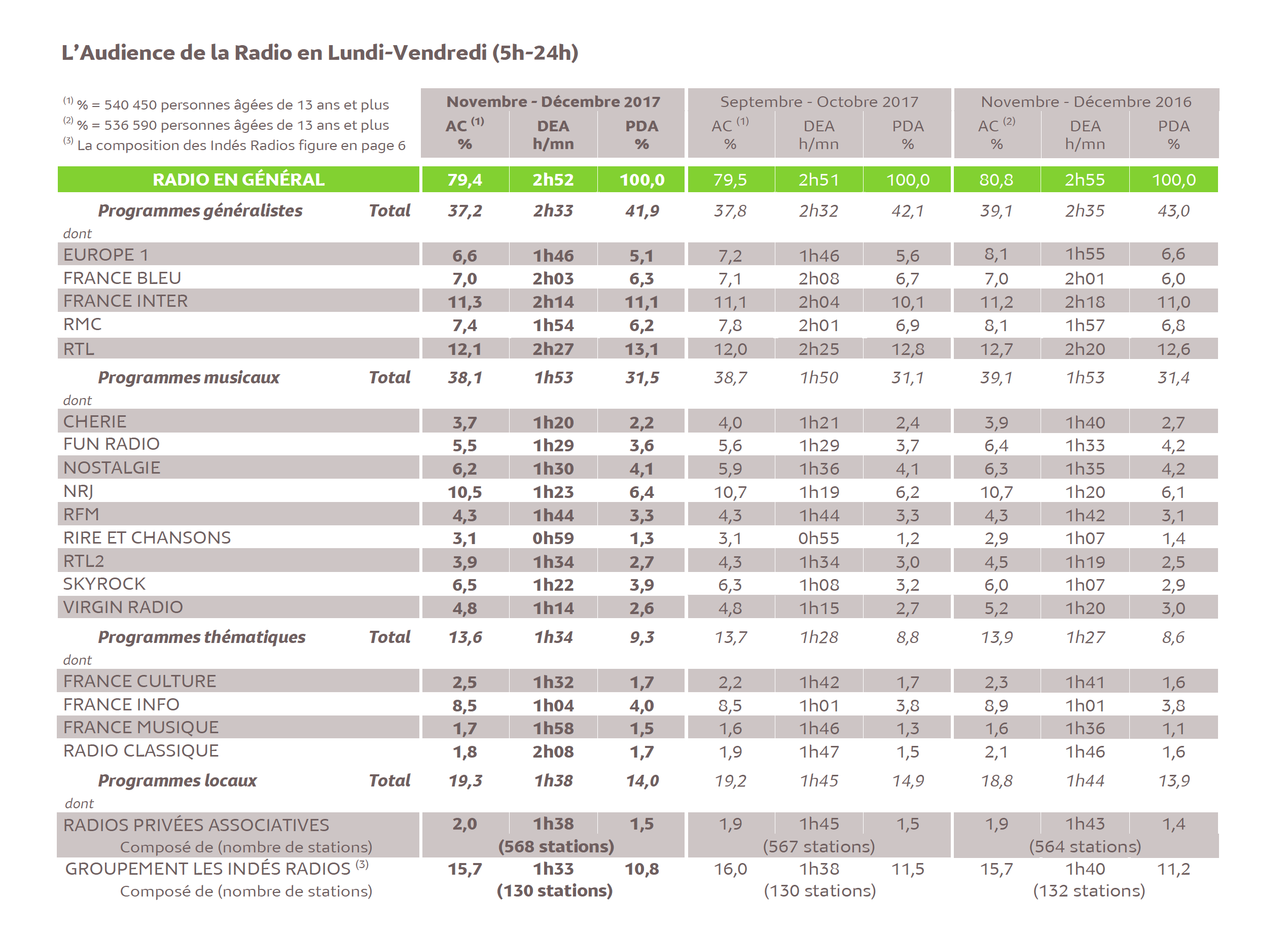 Plus qu'une simple vague, cette avant-dernière 126 000 Radio fera donc aussi, directement, et à sa façon, le pré-bilan de cette saison 2017-2018 et donnera, indirectement, le ton global de ce que sera le classement général de cette saison, sauf accident industriel. Forcément, les audiences d'Europe 1 seront particulièrement observées. Lors de la précédente 126 000 Radio, la radio de Lagardère Active avait enregistré un faible score de 6.6% d'audience cumulée loin dernière RTL (12.1%), France Inter (11.3%), RMC (7.4%) et France Bleu (7.0). Du côté des radios musicales, NRJ était la seule station au-dessus des 10 points.