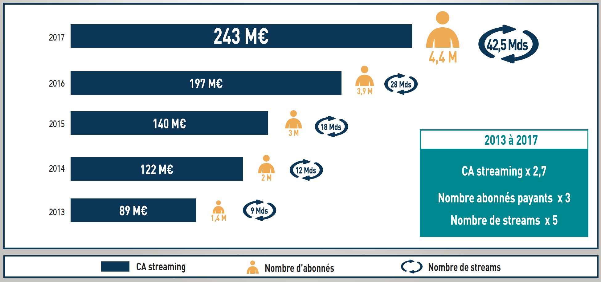 Le streaming, moteur de cette croissance, poursuit sa progression : ses revenus ont augmenté de 23% en 2017 (+37% en 2016) et avec 243M€, représentent 42% des revenus du marché total. C’est l’abonnement qui génère l’essentiel de la valeur créée : il représente, à lui seul, 83% des revenus du streaming et 35% des revenus du marché. Si la progression du nombre d’abonnés se poursuit à un rythme un peu moins soutenu, + 500 000 en 1 an, soit 4.4M d’abonnés, elle est compensée par une part plus importante des abonnés payants, hors bundle avec un opérateur téléphonique.