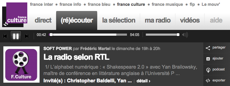 Comment la radio peut-elle s'adapter aux révolutions numériques ? Internet est-il une chance ou un danger pour son développement ? Doit-elle être filmée ? Quelques questions posées, dimanche dernier, sur France Culture à Christopher Baldelli, patron du pôle radio de RTL France.