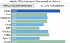 La radio affiche un ROI moyen de 2,00 $ selon Nielsen, soit bien au-dessus de la perception des annonceurs qui la placent en queue de classement. Ce graphique met en évidence l'écart entre efficacité perçue et efficacité réelle de chaque média.