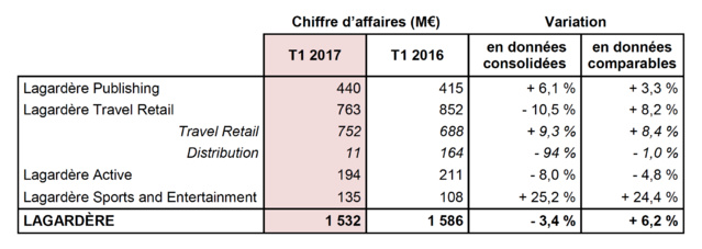 Le chiffre d’affaires de Lagardère Active s’établit à 194 M€, (- 8.0 % en données consolidées et - 4.8 % en données comparables). L’écart entre les données consolidées et les données comparables s’explique essentiellement par un effet de périmètre négatif (- 7 M€), principalement lié à la cession de LeGuide.com en septembre 2016. Le recul de l’activité s’explique principalement par la baisse du chiffre d’affaires publicitaire sur la période (- 8.1 %). Lagardère rappelle que "le poids du 1er trimestre est faible dans le chiffre d’affaires publicitaire annuel et que le contexte pré-électoral n’est traditionnellement pas favorable au marché publicitaire".