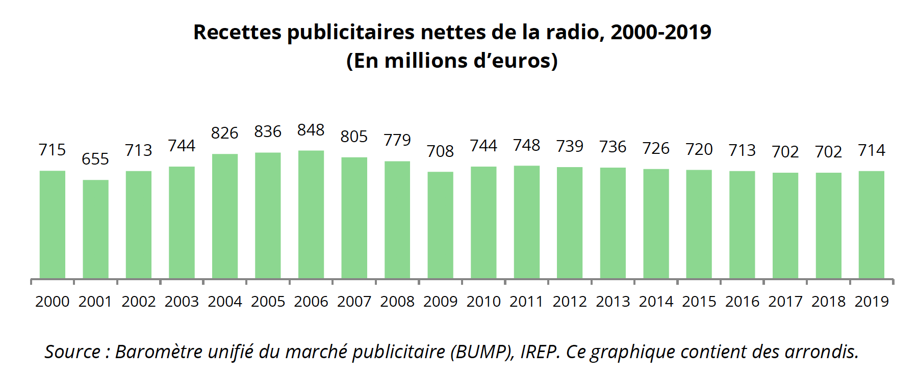 Les recettes publicitaires nettes de la radio connaissent en 2019 une croissance de 1,7%. par rapport à 2018 pour atteindre un montant de 714 millions d’euros. Ce regain fait suite à huit années de baisse consécutives (- 4,5 % en cumul entre 2010 et 2019). Les recettes demeurent ainsi relativement stables, notamment grâce à l’intégration des recettes publicitaires des activités en ligne des stations (nouveau périmètre). Le baromètre unifié du marché publicitaire (BUMP) 2019 intègre les recettes nettes des services en ligne dans le total des recettes publicitaires en télévision. Cumulées, les recettes tirées des supports numériques des médias traditionnels (télévision, presse et radio) se sont élevées à 432 millions d’euros en 2019 (+5,9 % par rapport à 2018), ce qui représente environ 7 % du total de leurs revenus.