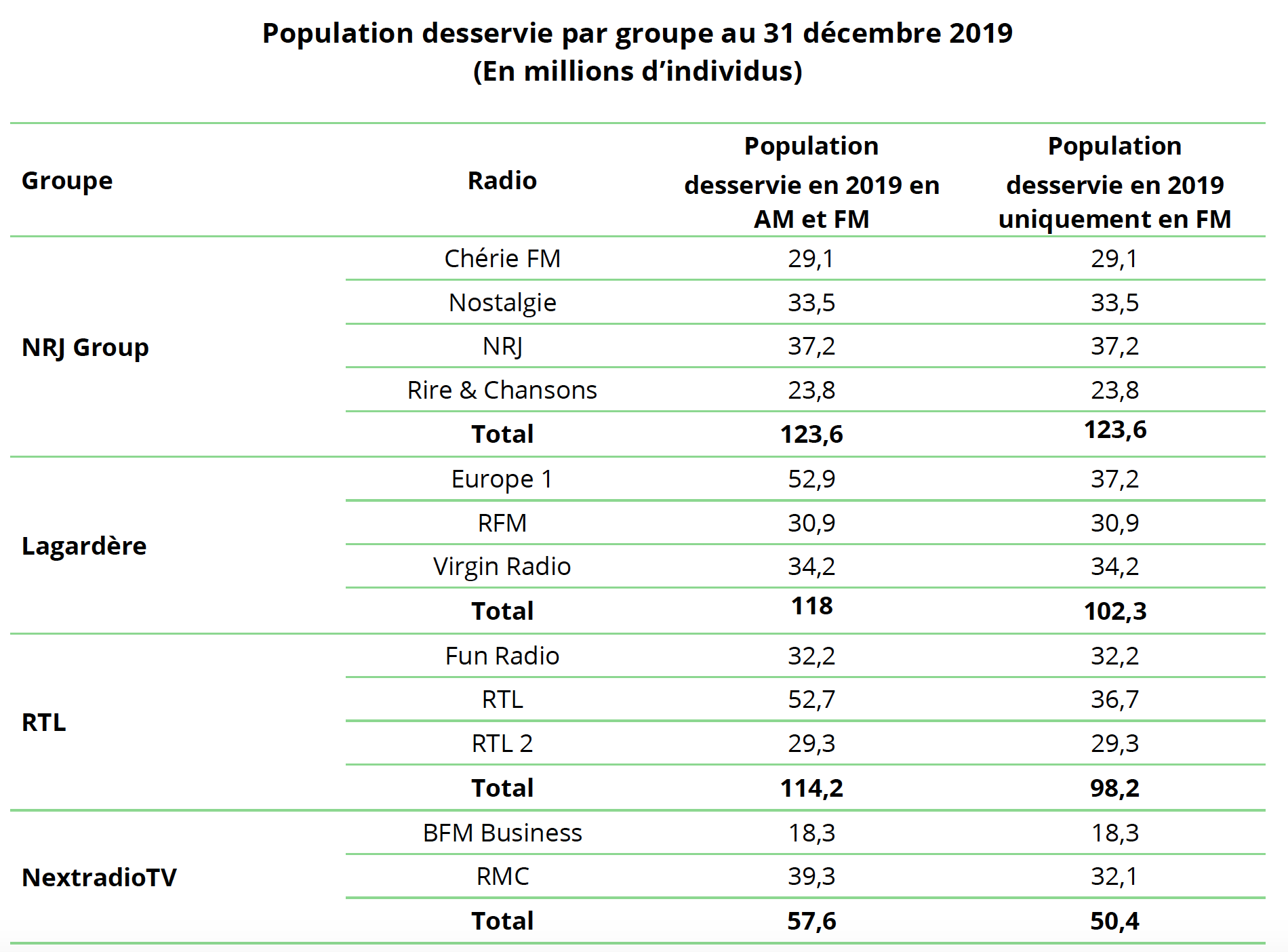 Dans le secteur de la radio analogique, qui est essentiellement diffusée en FM, la concentration des médias est contrôlée par un plafond de couverture de la population au-delà duquel aucune nouvelle autorisation d’émettre ne peut être délivrée par le CSA. Ainsi, selon l’article 41 de la loi du 30 septembre 1986, la somme des populations recensées dans les zones desservies par les différents réseaux contrôlés par une même personne physique ou morale ne doit pas excéder 150 millions d'habitants. C’est au CSA qu’il appartient de fixer la méthode de calcul de cette couverture, sous le contrôle du juge.