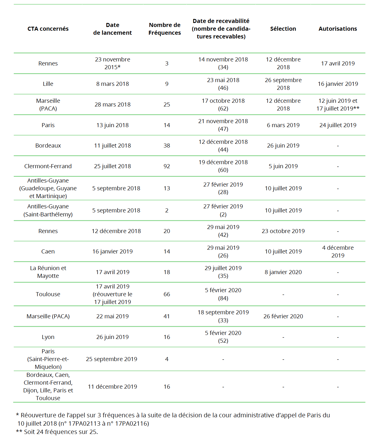 Préalablement au lancement des appels aux candidatures, les services du Conseil préparent les plans de fréquence. En 2019, parmi les 175 fréquences mises en appel, 25 étaient nouvelles : elles ont vocation à enrichir l’offre radiophonique du comité territorial de l’audiovisuel (CTA) de Toulouse. Par ailleurs, en 2019, le CSA a procédé aux agréments de sites pour 64 fréquences, aboutissant à la délivrance d’autorisations dans le ressort des comités territoriaux de l’audiovisuel de Caen, Lille, Marseille, Paris et Rennes. En 2019, le Conseil a lancé 7 appels aux candidatures FM et en a mené 4 à terme. S’agissant des radios d’autoroute, il a également déclaré reconductibles 6 autorisations d’émettre et reconduit 2 autorisations, dont une relative à 342 sites de diffusion.