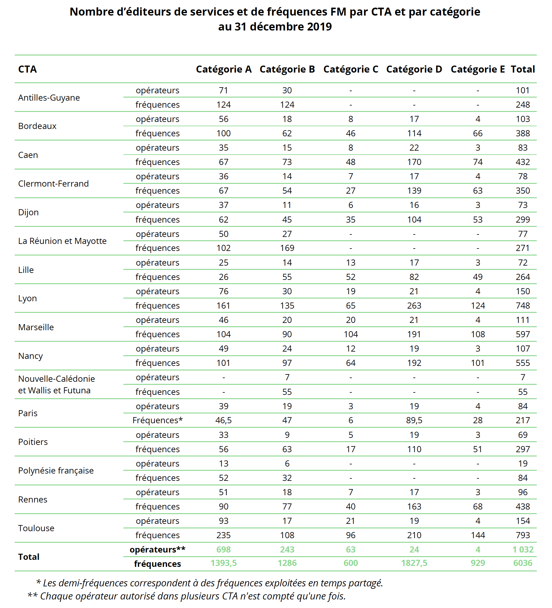 Les décisions prises en matière de radio en 2019 s’inscrivent à la fois dans le cadre d’appels aux candidatures partiels en radio analogique et dans le cadre d’appels aux candidatures en radio numérique (DAB+). Après les zones de Lille, Lyon et Strasbourg en 2018, l’année 2019 a été marquée par de nouveaux déploiements du DAB+ à Nantes et à Rouen. À la fin de l’année 2019, environ 25% de la population était couverte par la diffusion de services de radio en DAB+. Au 31 décembre 2019, 233 programmes étaient diffusés contre 147 en 2018 : 99 en catégorie A ; 67 en catégorie B ; 9 en catégorie C ; 45 en catégorie D ; 4 en catégorie E et 9 du service public. L’année 2020 sera marquée par la poursuite des déploiements de nouveaux multiplex et par le renforcement significatif de, l’offre de programmes à Paris, à Marseille et à Nice. Cette tendance a vocation à se poursuivre et s’accélérer en 2021 avec la délivrance de nouvelles autorisations et le déploiement des multiplex métropolitains.