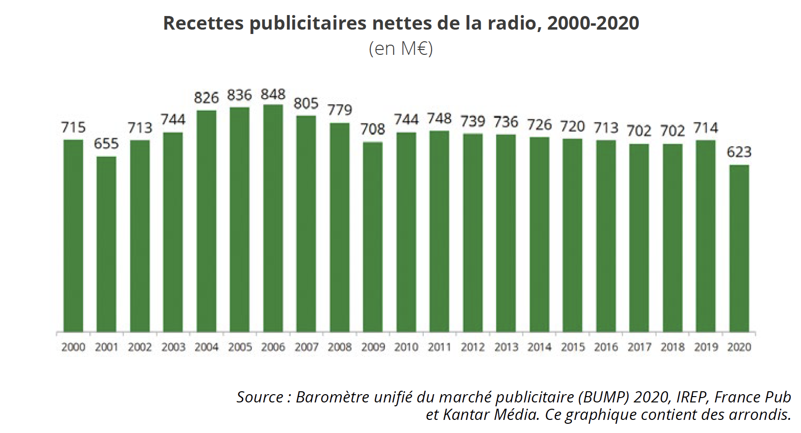 Les recettes publicitaires nettes de la radio connaissent en 2020 une baisse de 12.7 % par rapport à 2019 pour atteindre un montant de 623 M€. Cette baisse très nette est liée au retrait massif des annonceurs dans le contexte de la crise sanitaire et fait suite à une année 2019 en progression de +1.7 % par rapport à 2018. "Le secteur de la radio a toutefois montré une bonne réactivité tout au long de cette année de crise, notamment au troisième trimestre, témoignant de la vitalité de ce support publicitaire et de son attrait pour les annonceurs en période de reprise" rappelle le CSA.