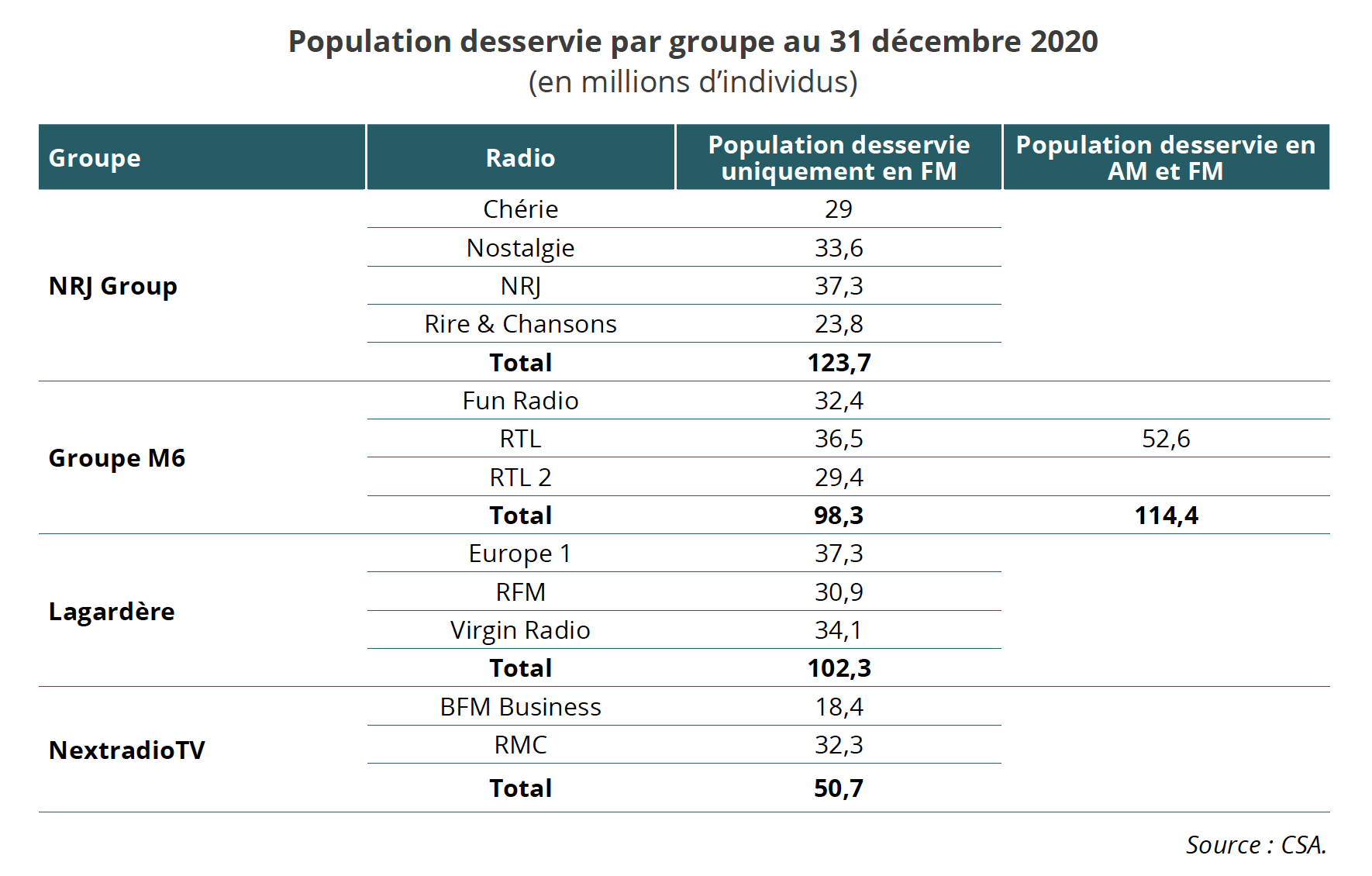Dans le secteur de la radio analogique, essentiellement diffusée en FM, la concentration des médias est limitée par un plafond de couverture de la population au-delà duquel aucune nouvelle autorisation d’émettre ne peut être délivrée par le CSA à un groupe. Ainsi, selon l’article 41 de la loi du 30 septembre 1986, la somme des populations recensées dans les zones desservies par les différents réseaux contrôlés par une même personne physique ou morale ne doit pas excéder 150 millions d'habitants. L’évolution la plus notable intervenue en 2020 concerne RMC, qui a arrêt d’exploiter sa fréquence en modulation d’amplitude en mars 2020.