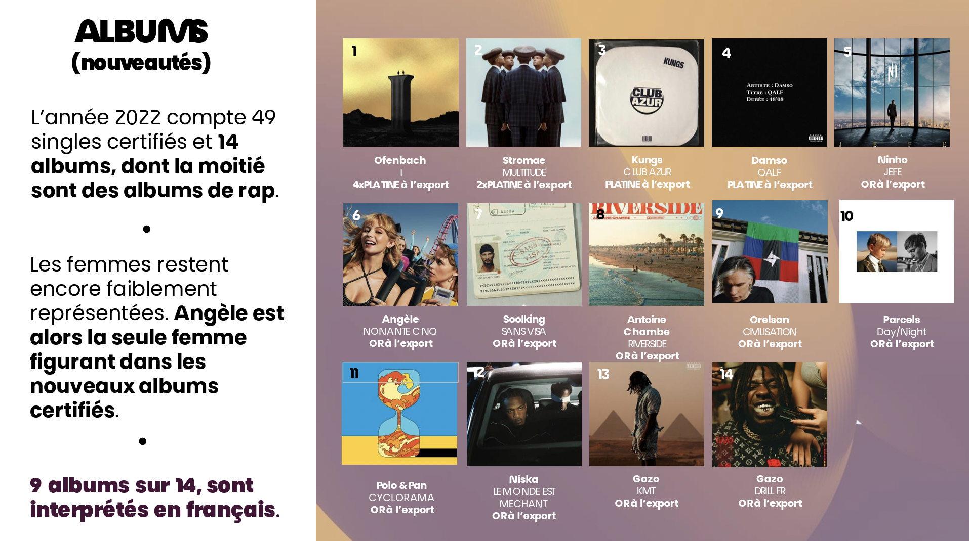 Présente dans 68% des nouveautés certifiées, la langue française est de plus en plus présente dans les titres et albums certifiés (+ 14% par rapport à 2021). La langue française est d’ailleurs portée par des artistes aujourd’hui incontournables en France comme à l’international. Aya Nakamura décroche 8 nouvelles certifications et passe notamment le seuil Platine avec son précédent album "Aya" (2020). Après un retour remarqué en octobre 2021 avec son single "Santé" (Diamant), l’artiste Stromae crée l’évènement avec son single "L’Enfer" en janvier 2022 (Diamant) puis avec la sortie de son album "Multitude", qui sera double Platine à fin 2022.