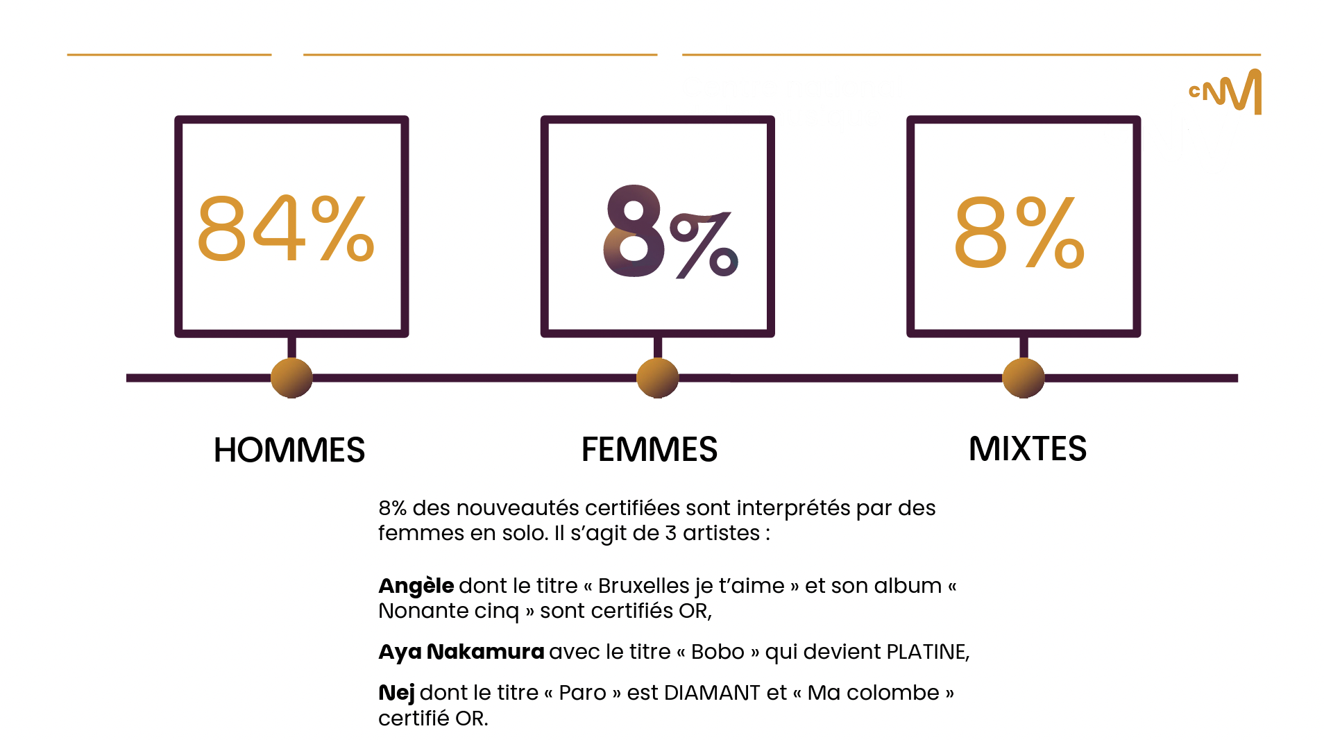 Avec des certifications pour des artistes relevant d’esthétiques allant du metal (Carpenter Brut), à l’électro swing (ProleteR sur son titre "April Showers"), en passant par la rumba (Fally Ipupa) ou encore la pop (L’Impératrice), ces résultats révèlent la diversité musicale française et attestent de sa grande capacité de développement hors de nos frontières. Seul regret, l’export français reste encore en dessous des attentes en termes de parité femmes-hommes puisque seulement 8% des nouveautés certifiées sont portées par des femmes : Aya Nakamura, Angèle et Nej.
