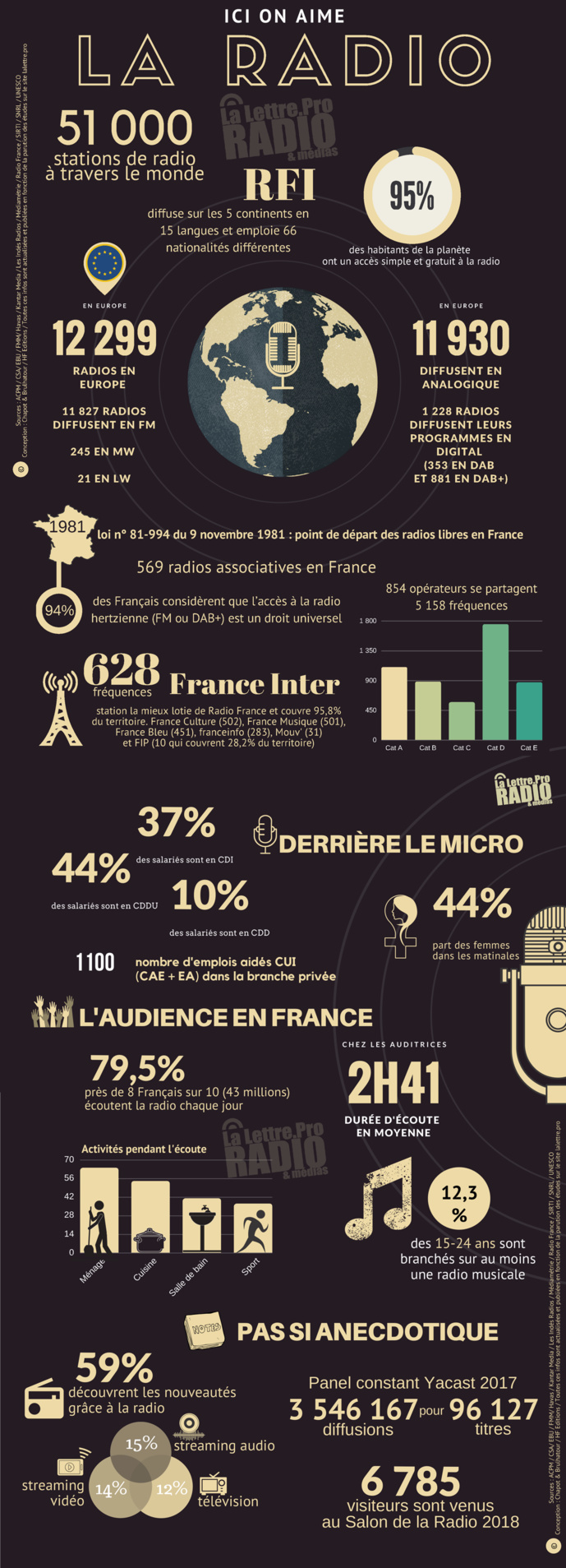 À l'occasion de la parution du centième numéro de La Lettre Pro de la Radio, l'équipe dévoile une infographie exclusive sur une double-page pour tout connaitre de l'industrie d'aujourd'hui : éditeurs, fréquences, emploi, audiences, comportements d'écoute, spécificités musicales. Une infographie qui s'appuie sur les dernières études du secteur de la radio en France et dans le monde.Fondateur et directeur de la publication de La Lettre Pro de la Radio et du Podcast et de Podcast... En savoir plus sur cet auteur