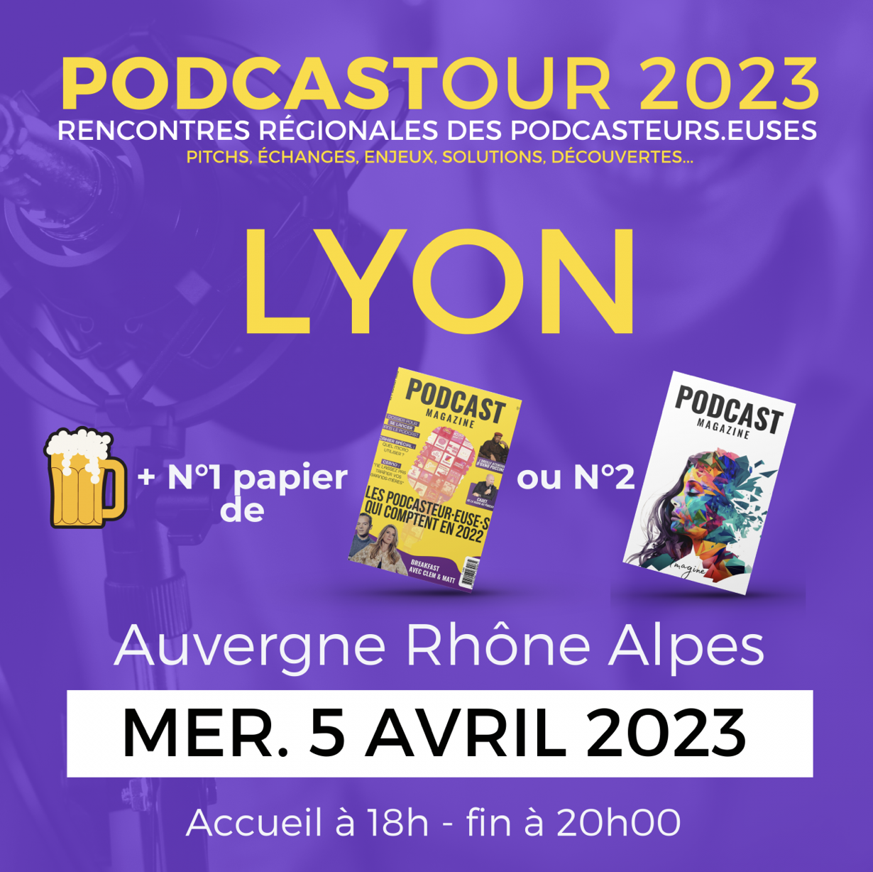 La première des cinq étapes du RadioTour 2023 aura lieu à Lyon, le jeudi 6 avril prochain de 08h30 à 17h dans les espaces du Ruck Hôtel. Tous les professionnels de la radio lyonnaise et de la région Auvergne-Rhône-Alpes y sont attendus pour une journée exclusive de débats, de rencontres et d'échanges... La veille, et au même endroit, ce sont les podcasteurs qui pourront se rencontrer grâce à l'équipe de Podcast Magazine. Cette rencontre se déroulera de 18h30 à 20h00.