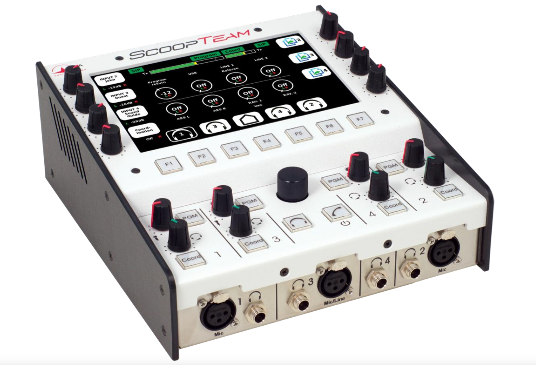 Idéal pour les reportages sportifs TV et Radio, ScoopTeam est un poste de commentateur intégrant un codec pour la transmission en direct d'un ou deux signaux audio en haute qualité audio (jusqu'à 20 kHz). Les deux canaux audio peuvent être routés vers une seule destination (transmission en double mono codec), ou deux destinations différentes (double codec). L'interface est intuitive, avec touches rétroéclairées et potentiomètres dédiés et assignables pour le contrôle des réglages et l'ajustement du volume. ScoopTeam est conçu pour fonctionner essentiellement en IP, mais il peut également transmettre via des modes alternatifs de transmissions disponibles en option : RNIS, AoIP via 3G/4G, Wi-Fi via USB, Voix mobile avec Voix HD™.