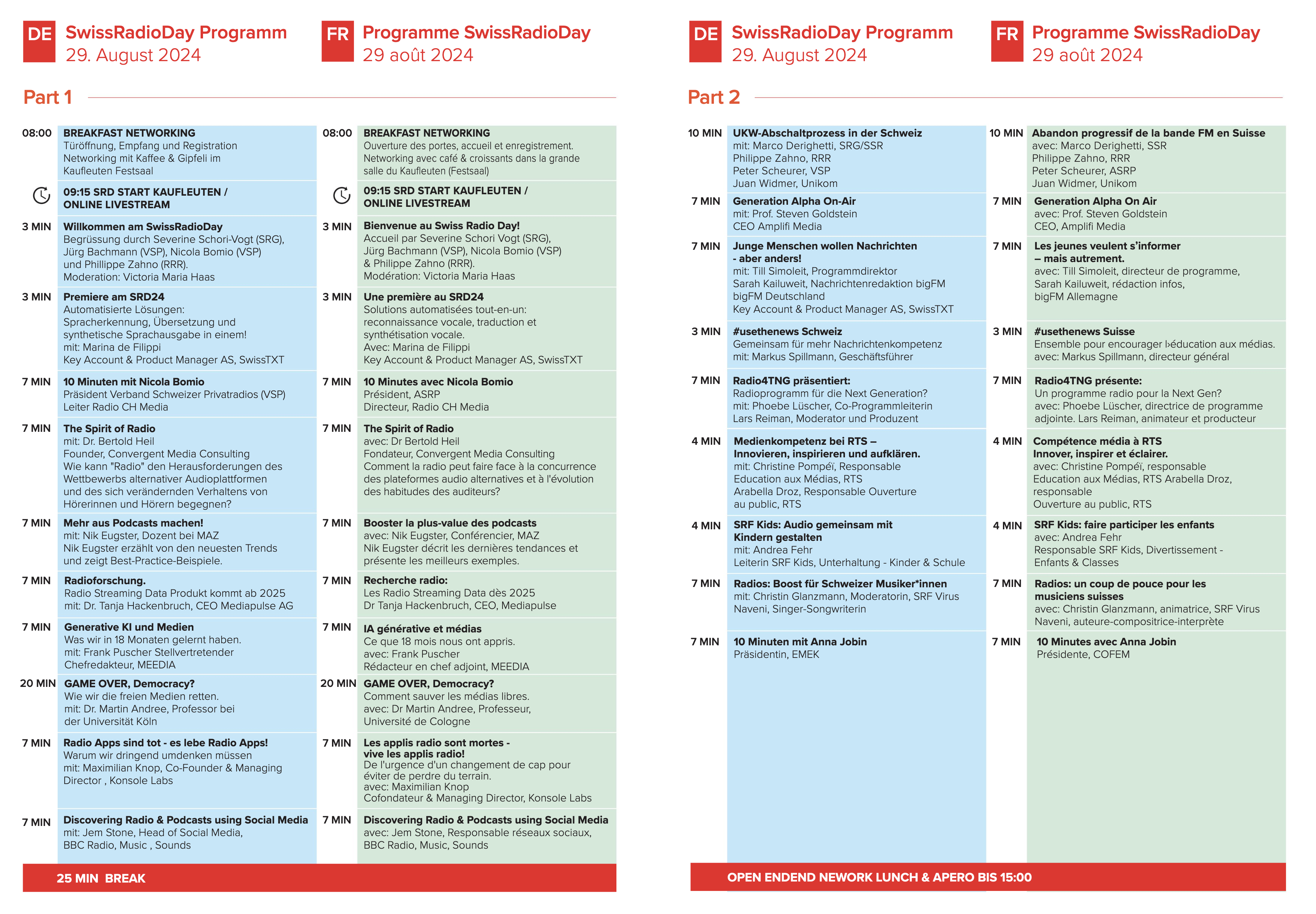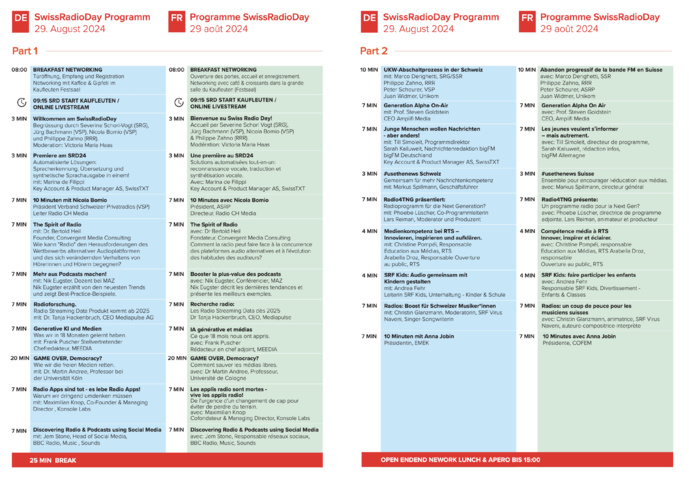 Le programme 2024 affiche de grands noms de l'univers de la radio et des médias. Martin Andree pour évoquer le thème Big Tech, Arabella Droz (RTS) pour la promotion média auprès des jeunes, Jem Stone (responsable Social Media à la BBC) pour expliquer la plus-value des réseaux sociaux sur la radio et BBC Sounds, Dr. Anna Jobin (EMEK), Bertold Heil, Dr. Steven Goldstein (University of NYC) qui analysera les habitudes radio de la génération alpha, Maximilian Knop pour la fin des applications radio, Dr. Tanja Hackenbruch, (Mediapulse) au sujet des données de streaming, York Strempel (KissFM Berlin) qui présentera les jeunes talents de la radio ou encore Nik Eugster, (CH Media) pour parler de la plus-value des podcasts pour la radio...