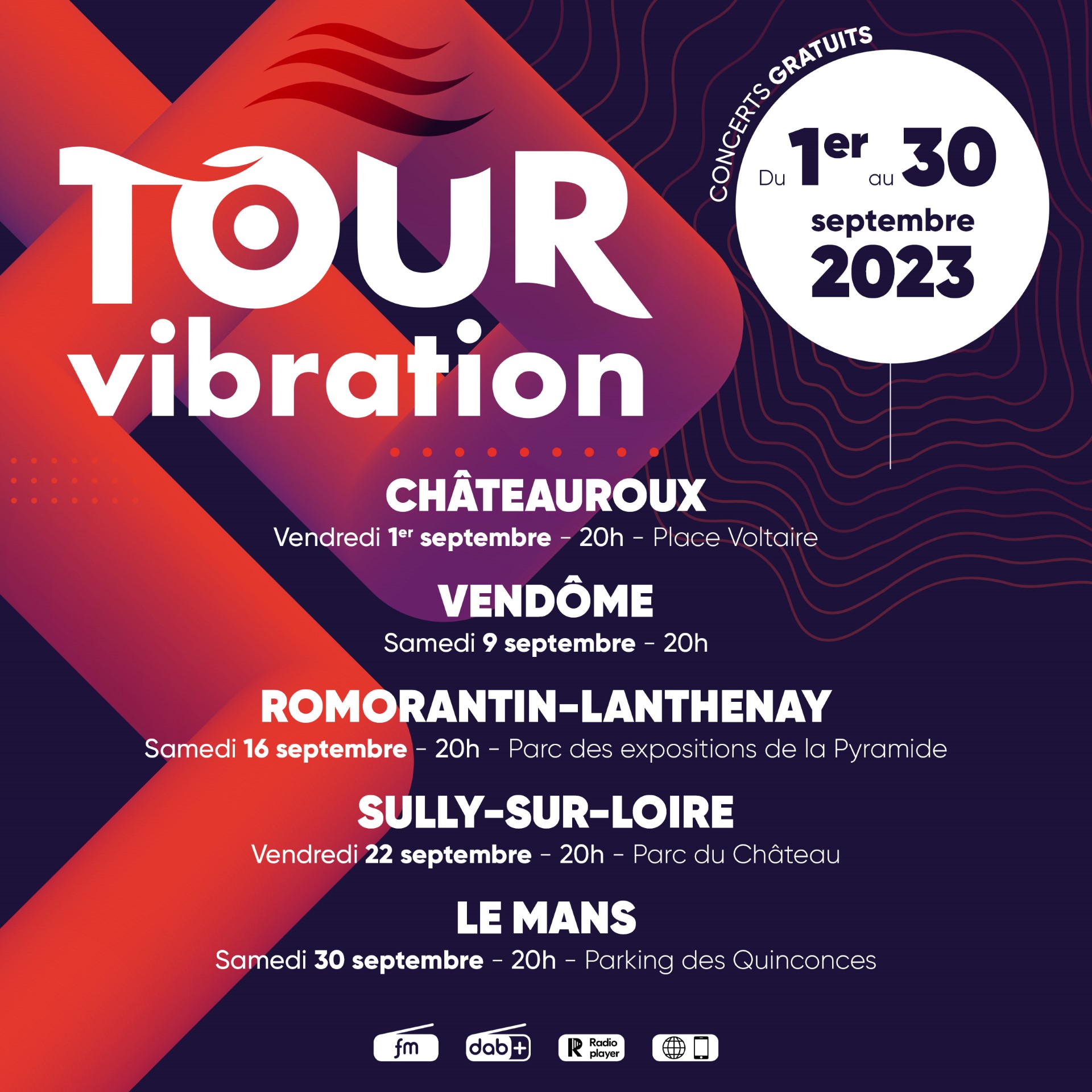 Le Tour Vibration passera par Châteauroux sur la Place Voltaire le 1er septembre à 20h, par Vendôme le 9 septembre à 20h, par Romorantin-Lanthenay au Parc des expositions de la Pyramide le 16 septembre à 20h, par Sully-sur-Loire au Parc du Château le 22 septembre à 20h et par Le Mans au parking des Quinconces le 30 septembre à 20h.