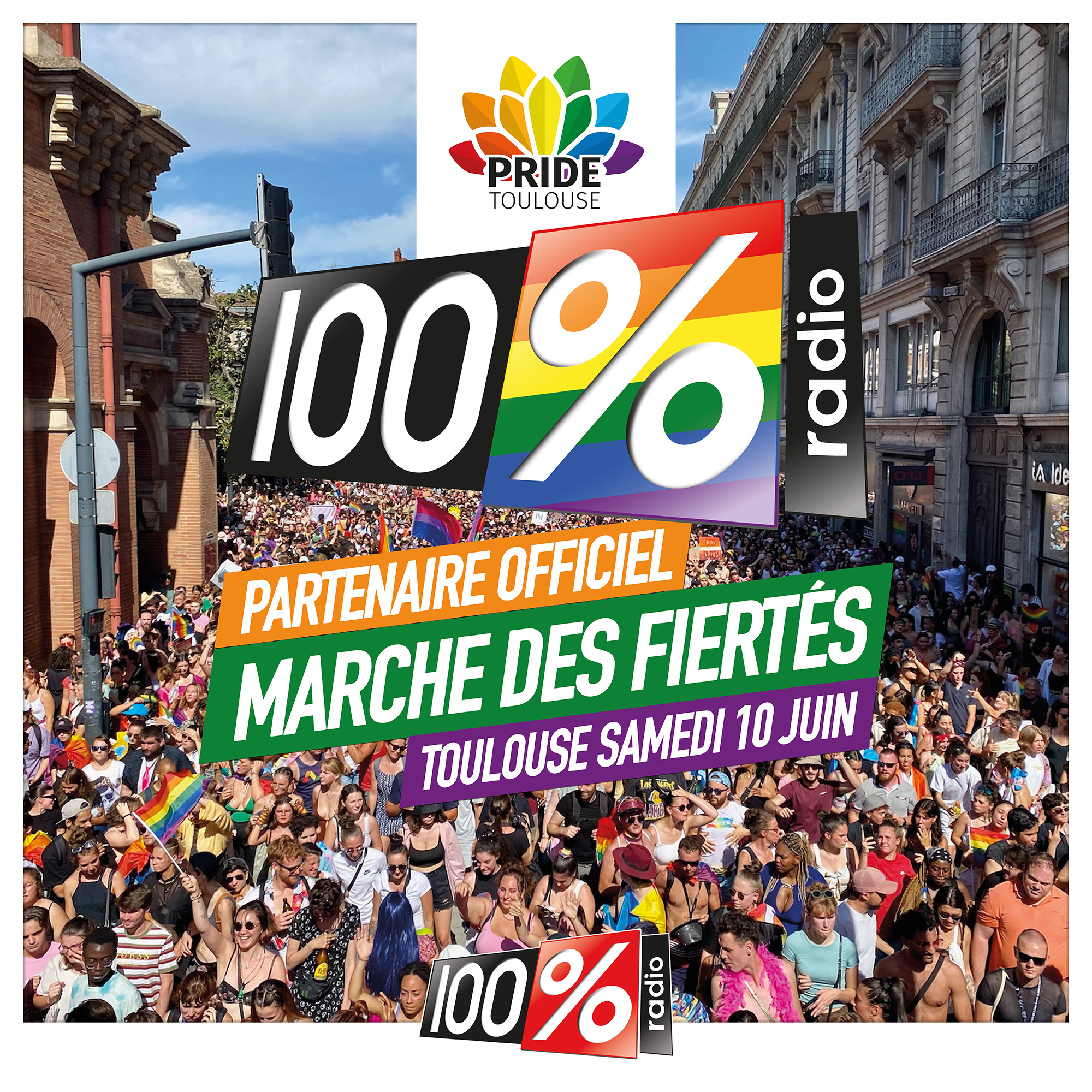 Cette année encore, 100% Radio première radio indépendante en Occitanie s’engage aux côtés de l’association Pride Toulouse qui organise l’une des plus grandes manifestations de défense des droits LGBTQI+ de France : "100% est une radio 100% positive et multigénérationnelle qui défends depuis sa création en 2000 son ancrage territorial en Occitanie autour de valeurs de tolérance, de bienveillance et de solidarité" rappelle la station.
