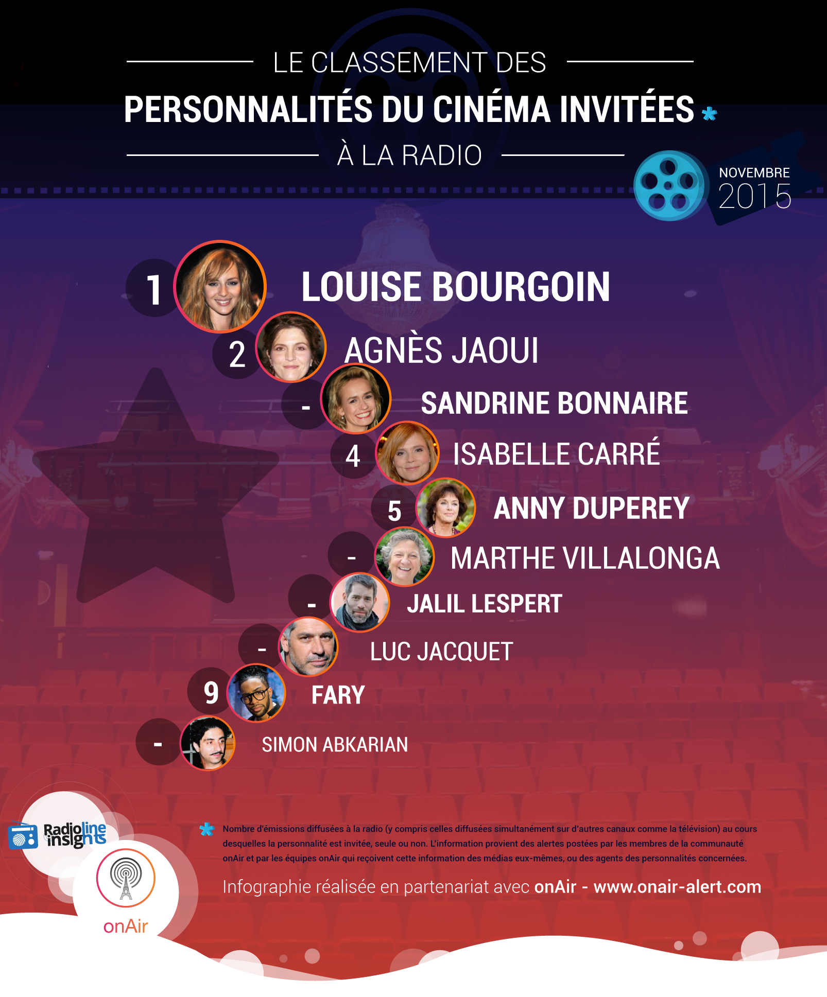 Tête d’affiche du premier long-métrage de Laurent Larivière "Je suis un soldat", Louise Bourgoin était la personnalité du cinéma la plus convoitée par les radios au mois de novembre, d’après les informations de onAir. Agnès Jaoui et Sandrine Bonnaire se partagent la deuxième place du classement devant Isabelle Carré, invitée pour son rôle dans le nouveau film des frères Larrieu "21 nuits avec Pattie". Marthe Villalonga, Jalil Lespert et Luc Jacquet sont également présents dans ce top.