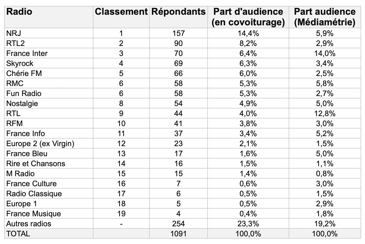 Les conducteurs privilégient la bonne ambiance dans le véhicule, auprès de passagers d’âges parfois très différents et qui ne se connaissant pas forcément entre eux. Les radios musicales comme NRJ, RTL2, Skyrock et Chérie FM sont les grandes gagnantes du classement chez les covoitureurs et surperforment les derniers résultats du classement Médiamétrie.