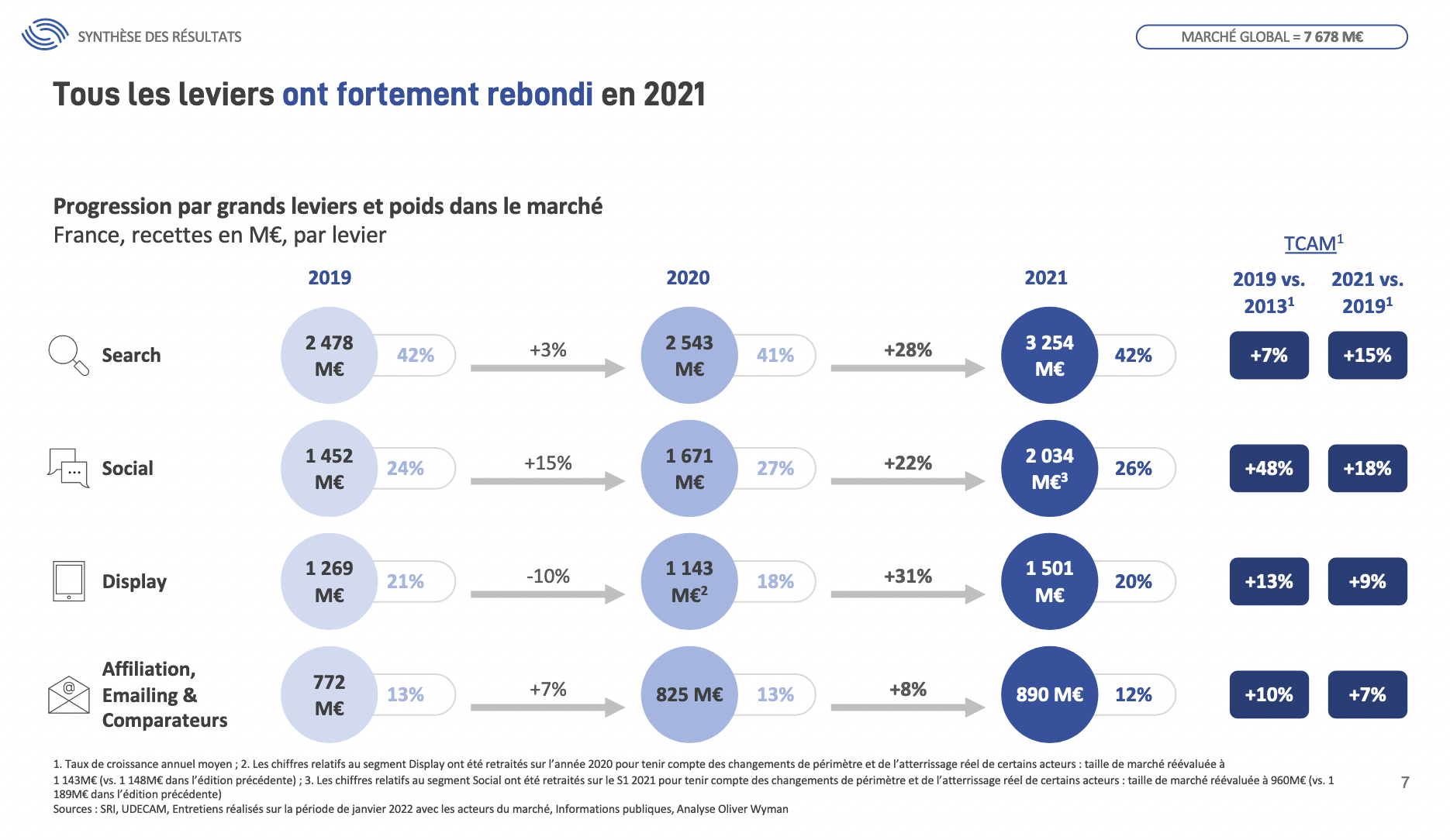 En 2021, l’ensemble des leviers de la publicité digitale a fortement rebondi après la crise avec une croissance de 24 % (7.7Mds €) par rapport à 2020. Le Search enregistre une forte croissance de + 28% et pèse 42% (3 254 M€) du marché. À noter la poussée du Retail Search à + 56%, qui compte désormais pour 12% du Search. Le Social croît de + 22% sur l’année tandis que son poids se stabilise à 26% (2 034 M€). Le Display, qui avait plus souffert de la crise que les deux premiers leviers, affiche une croissance exceptionnelle de + 31% (1 501M€). Il compte pour 20% du marché... L’Affiliation, l’Emailing et les comparateurs, préservés des effets de la crise du fait de leur logique de performance, enregistrent + 8% et représentent 12% du marché (890 M€).