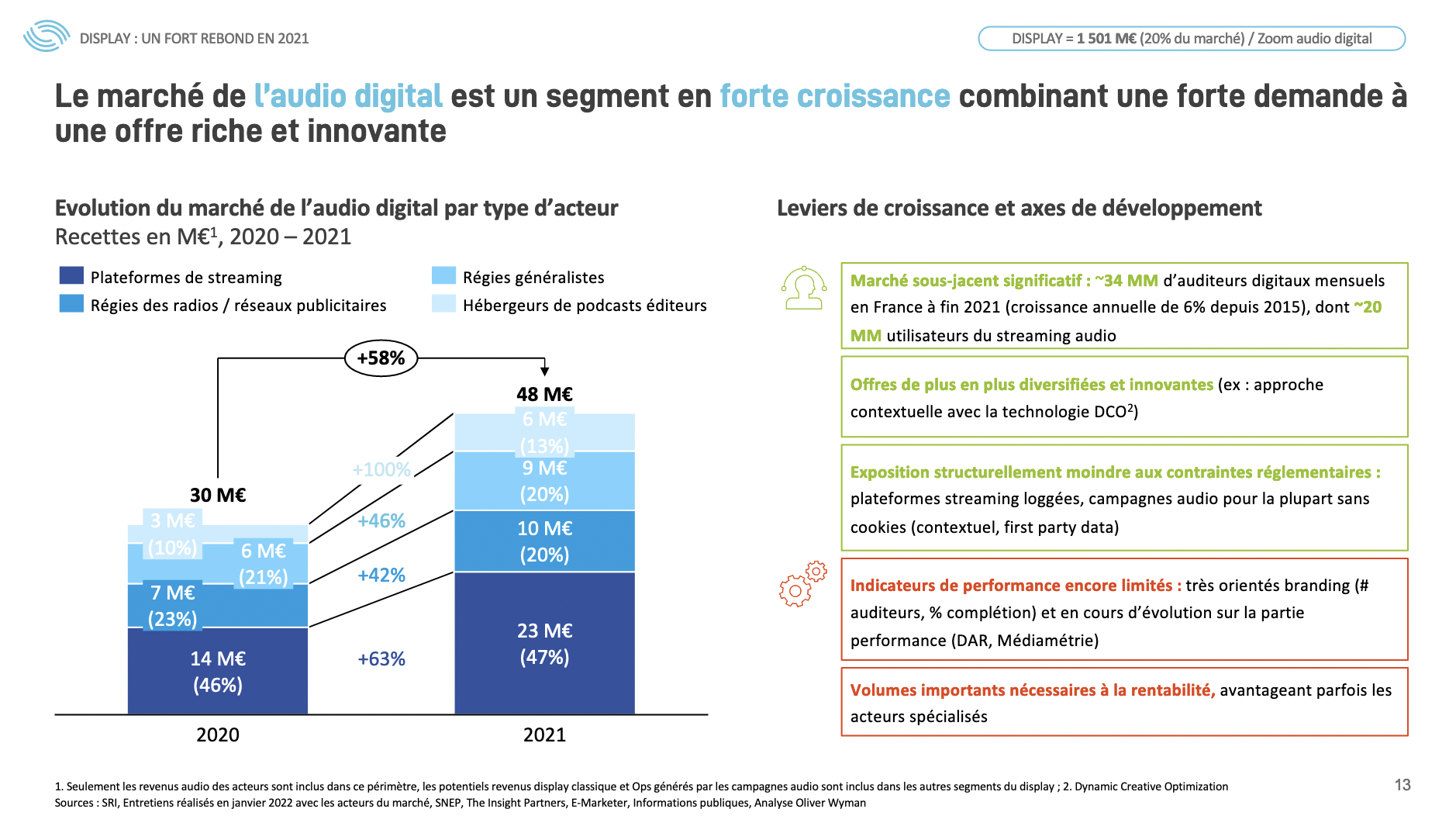 En 2020, si le marché avait globalement moins souffert des effets de la crise sanitaire que les autres médias, sa croissance avait toutefois connu un net ralentissement. En effet, de 2019 à 2020, le chiffre d’affaires du digital, principalement porté par le Social et le Search, a cru de seulement 4% alors que le taux annuel moyen de croissance s’élevait à + 14% depuis 2013. Dès 2021, le marché retrouve sa dynamique pré-Covid avec une croissance de 29% par rapport à 2019...