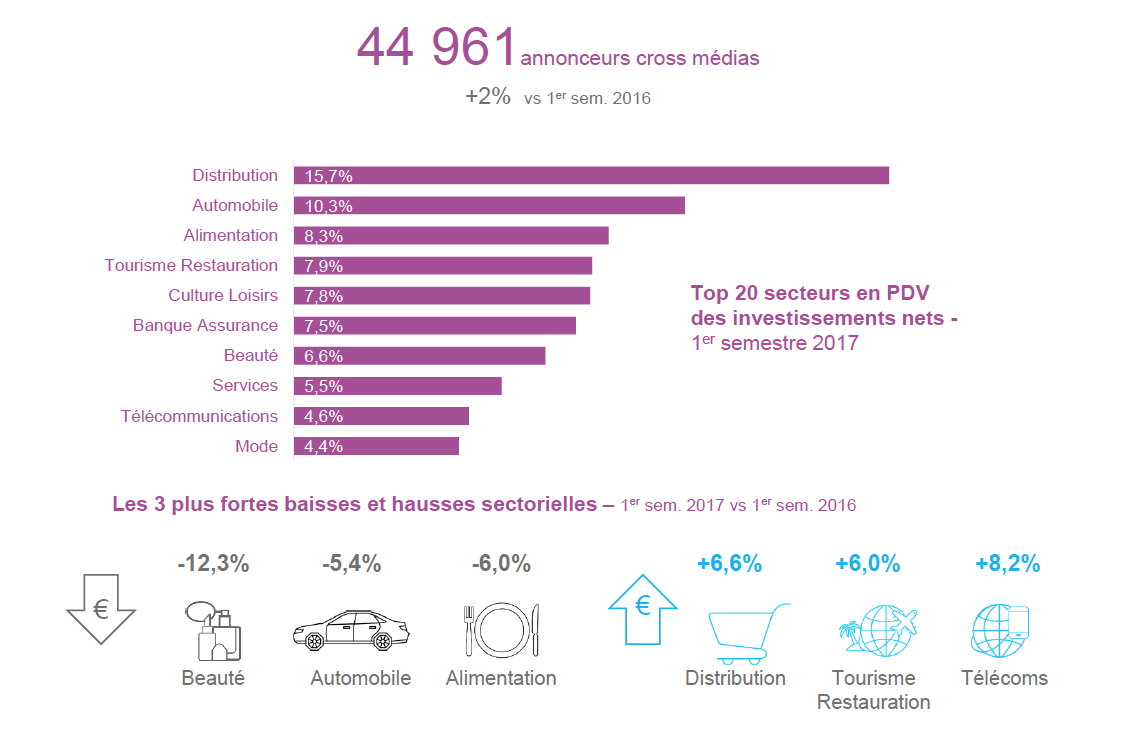 Le marché publicitaire cross médias référence 44 961 annonceurs soit 2% de plus qu’au 1ersemestre 2016. Et même si la presse capte encore près d’1 annonceur sur 2 (47%), les médias digitaux attirent toujours le plus grand nombre d’intervenants avec un taux de présence de 59% (+ 3 points) pour le search et le display réunis. C’est également la sphère digitale qui recrute le plus : + 8% versus + 5% en TV et - 8% en radio. La distribution poursuit sa progression et représente 15.7% des investissements nets avec un poids toujours plus important pour les enseignes spécialisées (8%) versus les GMS (5%). Le secteur réalise la plus forte progression du semestre en valeur (+ 6.6%) suivi du tourisme (+ 6%) et des télécommunications, ce dernier renouant avec une croissance (+8.2%).