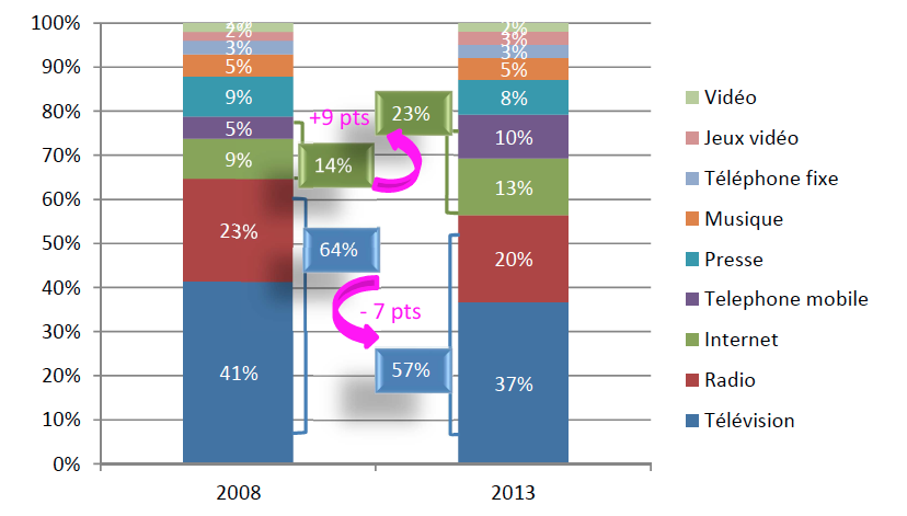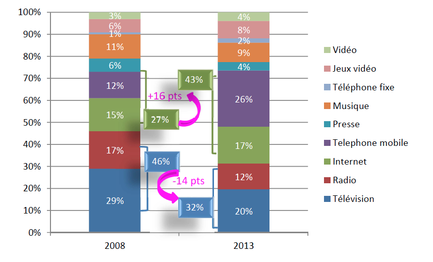 Source : Médiamétrie-Media in life – bases : Lundi-Dimanche 2008, 2013, 0h00-24h, 13 ans et plus et 13-24 ans, parts de présence