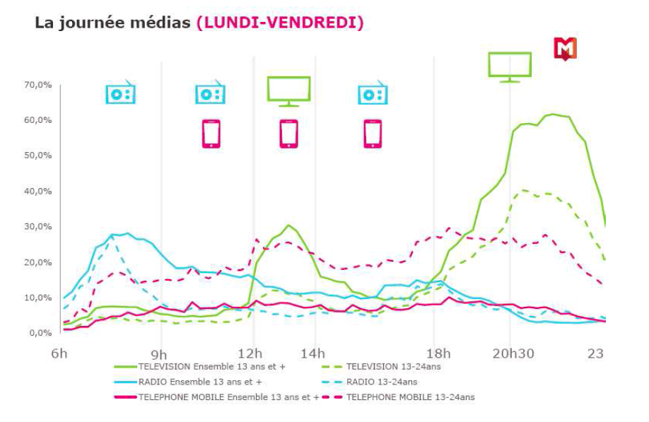 La redistribution rapide de leurs contacts médias et multimédias sur la journée entre 2008 et 2013 au bénéfice d’internet (fixe) et du téléphone mobile. La particularité de leur courbe média au cours de la journée qui présente deux pics : la radio le matin et la télévision le soir avec une présence d’internet (fixe) dans leurs usages dès 14h00 et de manière continue et progressive jusqu’à 22h30 ;