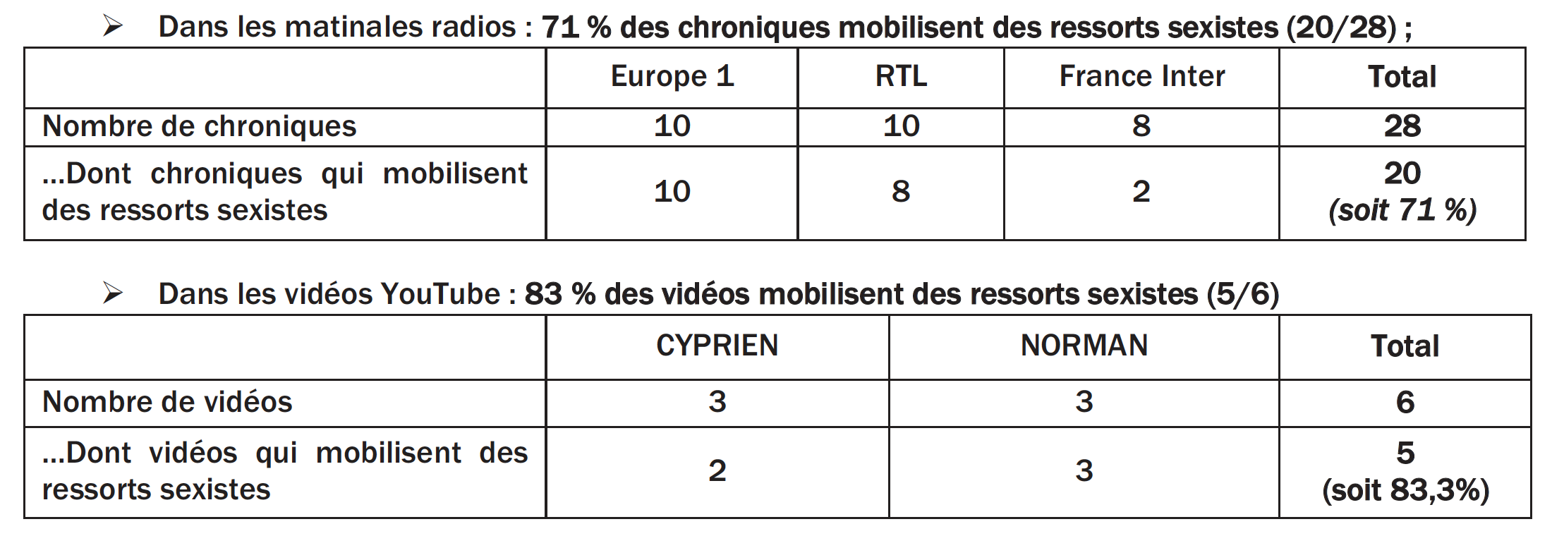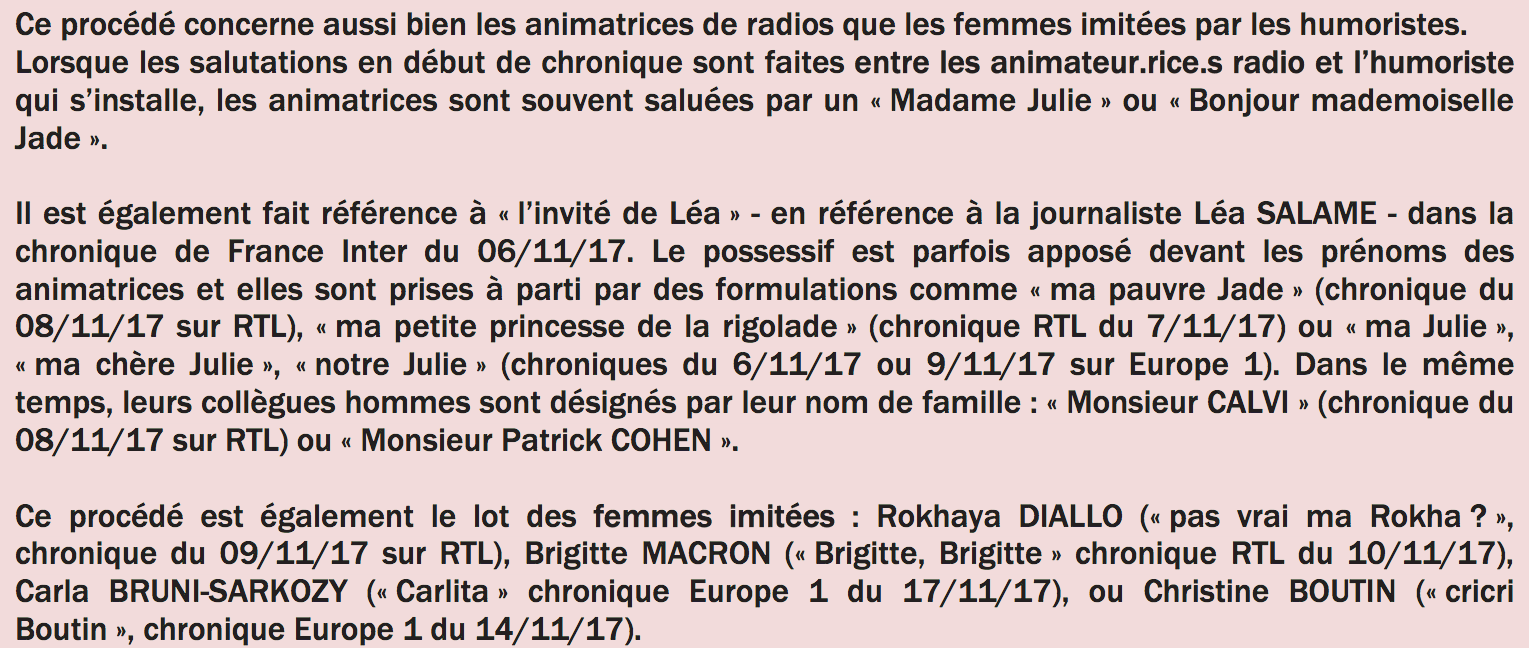 "Les ressorts sexistes se manifestent par ses stéréotypes et des rôles de sexe utilisés à la fois dans les interactions entre les personnages mis en scène, dans l'apparence des personnages femmes et hommes et dans les caractères et rôles qui leur sont respectivement attribués. L'analyse montre que le sexisme est mobilisé de manière massive quand il s'agit de susciter le rire" indique dans un rapport le Haut Conseil à l'Égalité entre les femmes et les hommes.
