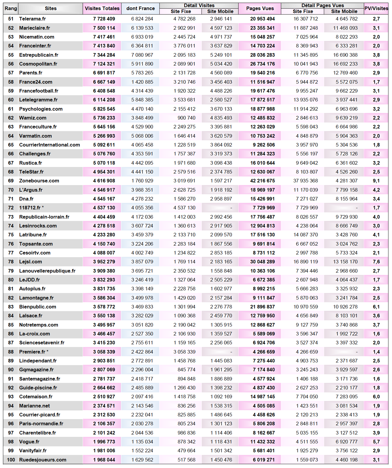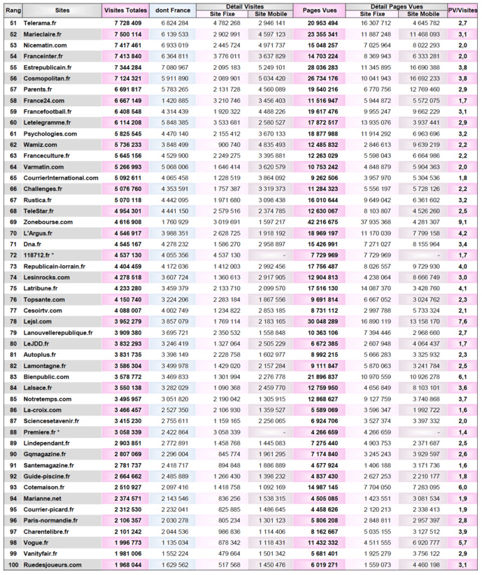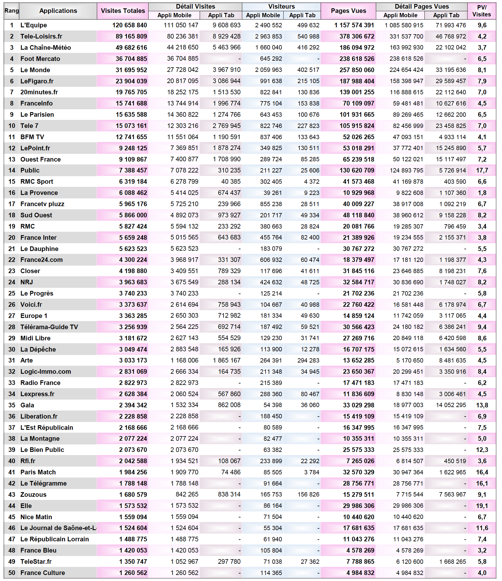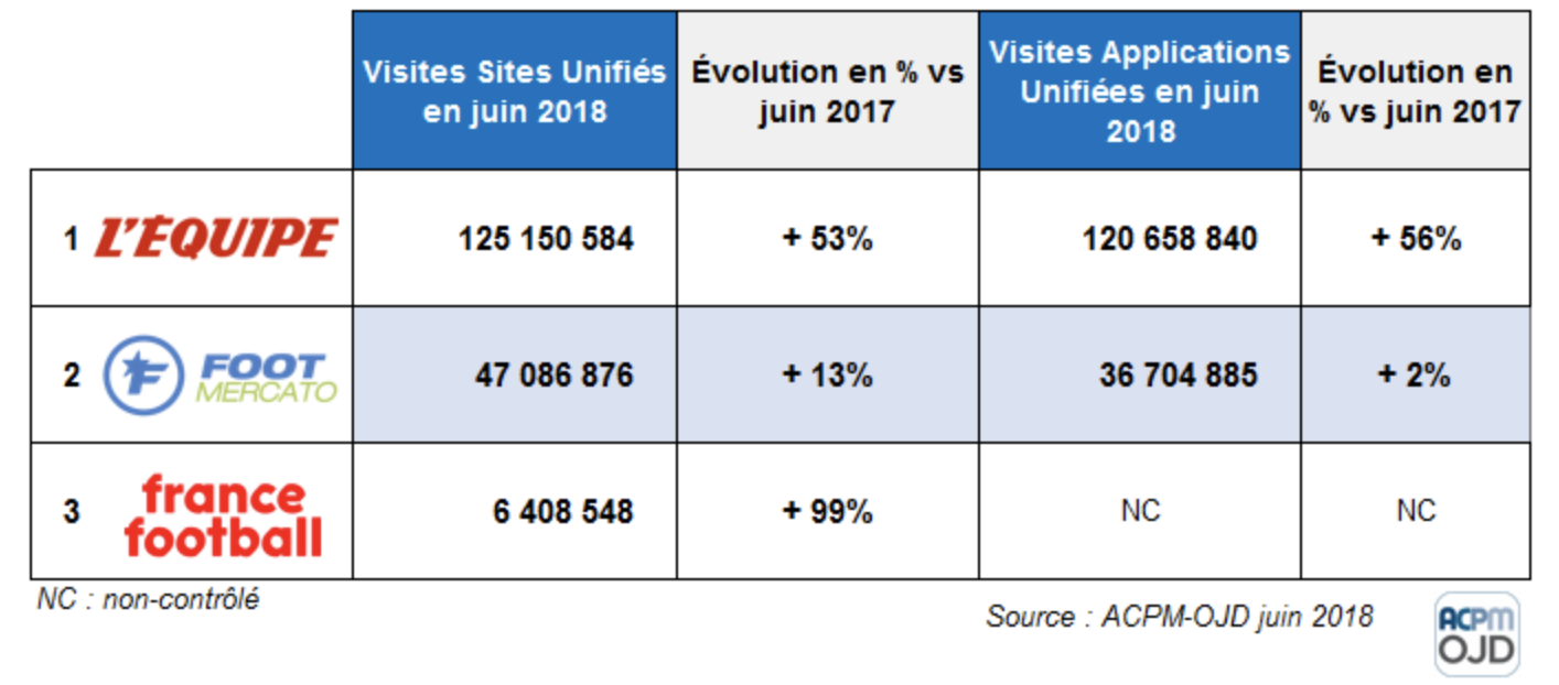 L'ACPM a dévoilé les chiffres de fréquentation des sites web fixes et mobiles, des applications mobiles et tablettes ainsi que des contenus distribués, certifiés durant le mois de juin 2018. À l'occasion de la Coupe du monde de football, les trois premiers sites de sport spécialisés totalisent plus de 335 millions de visites sur le mois de Juin (+40% d'évolution versus juin 2017).