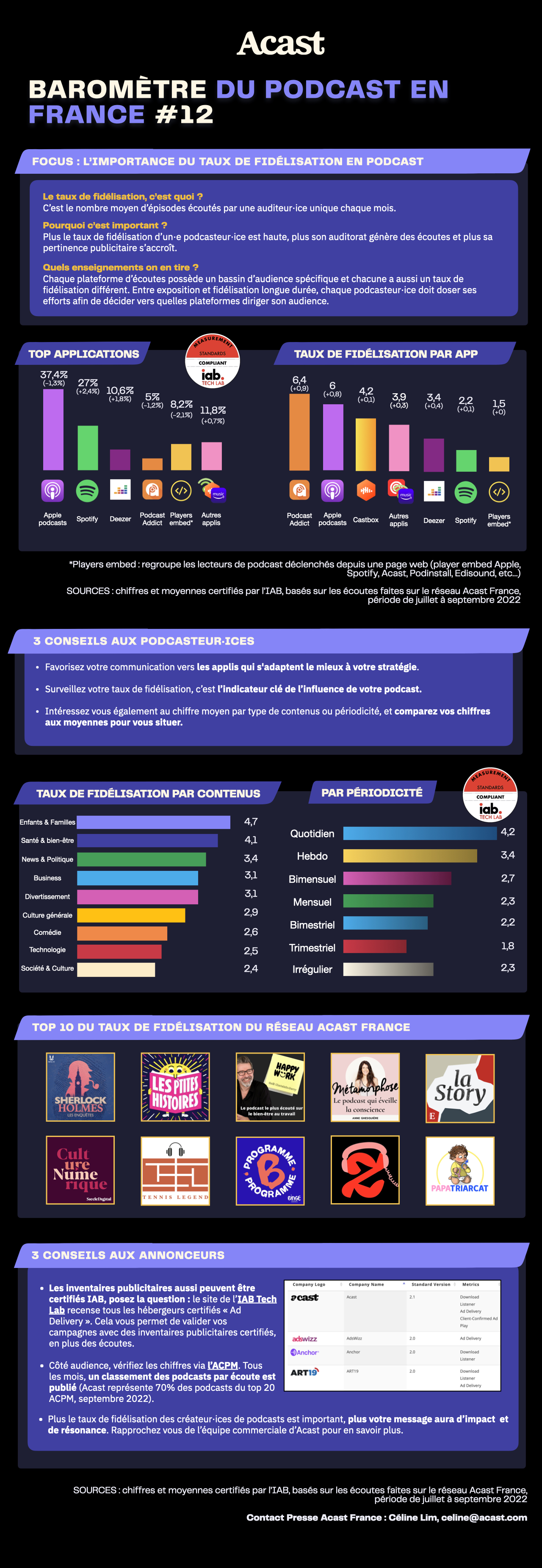 D'abord, certaines applications d’écoutes génèrent de la visibilité, d’autres de la fidélisation. Il est donc important pour les podcasteurs de favoriser dans la communication les plateformes qui collent le mieux à leur stratégie à savoir se faire découvrir et fidéliser les audiences. Ensuite, le taux de fidélisation est un indicateur clé de l’influence de votre podcast : un chiffre de fidélisation qui baisse est un indicateur critique qui peut montrer une forme de désamour de vos auditeurs où le fait que vos nouveaux auditeurs ne s’abonnent pas. Enfin, les baromètres Acast montrent le taux de fidélisation moyen par plateforme, mais ces précédents baromètres montrent aussi le chiffre moyen par type de contenus. Il ne faut pas hésiter à comparer les chiffres des podcasts aux moyennes pour savoir comment il se situe. À titre de comparaison pour la période juillet-septembre : les podcasts "Enfants & Familles" (4.7 épisodes écoutés par auditeur unique chaque mois) et "Santé" (4.1 épisodes) tirent leur épingle du jeu suivi par les "News & Politique" (3.4 épisodes), "Business" (3.1 épisodes) et "Divertissement" (3.1). Les sujets de technologie et de société et culture ferment la marche avec un taux de fidélisation à 2.4 épisodes écoutés par auditeur unique et par mois.